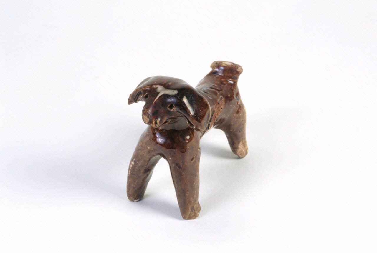 Sifflet en terre cuite vernissée, de couleur marron, représentant un chien (ou une brebis ?), avec deux trous latéraux opposés placés sur le dos. Le système d'insufflation (conduit d'air aménagé) se trouve sur la queue. / Représente un animal (mouton ?) aux grandes oreilles tombantes dont le corps creux forme le résonateur d'une flûte globulaire. L'embouchure se dresse presque verticalement à l'arrière du corps avec le trou d'insufflation percé à l'extrémité supérieure. Une fenêtre rectangulaire étroite est percée à l'arrière du corps. Une petite fente percée à l'avant au milieu de chaque flanc sert de trou de jeu. L'objet est modelé assez grossièrement en terre beige. Il est couvert d'une glaçure marron sauf l'arrière de la patte arrière droite et le tour de la fenêtre qui restent brutes. Les yeux sont indiqués simplement par un point incisé. Les narines et la bouche sont formés également de traits incisés. Un autre trait est incisé à l'avant des oreilles.Décor