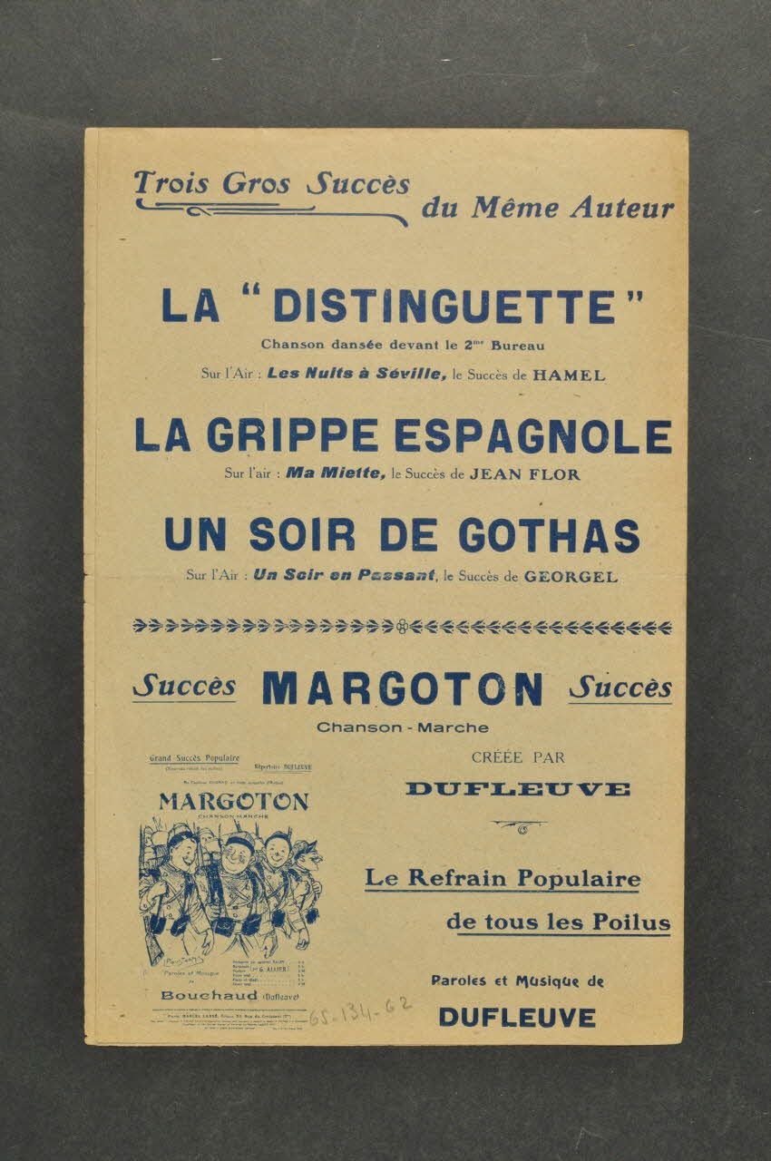Les inscriptions renseignent le titre de la chanson, le nom des auteurs, de l'artiste et de l'éditeur. A l'intérieur, partitions et paroles de la chanson. Au dos, liste d?autres partitions publiées par l?éditeur.Décor