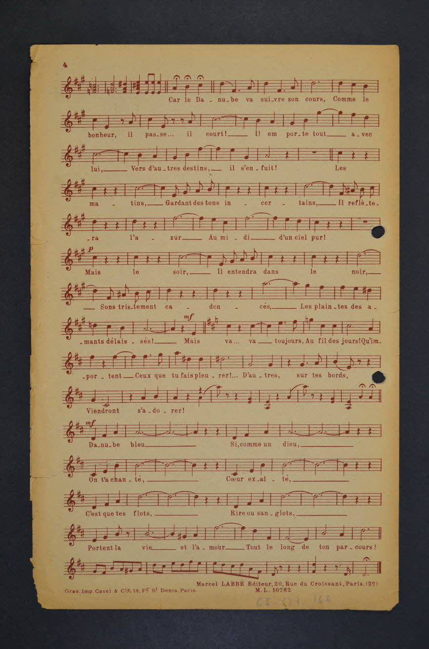 Des inscriptions renseignent le titre, les auteurs, les exécutants et l'éditeur. A l'intérieur et au dos, partition et paroles de la chanson. La partition est perforée avec oeillets pour le rangement.Matériaux et techniques