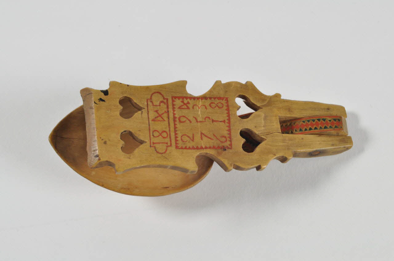 Bois taillé gravé, incrustations cire / Cuilleron en forme de coeur, prolongé par un manche plat articulé à tenon. Les bords du manche sont découpés d'arabesques. Il présente de bas en haut : un visage stylisé gravé incrusté de cire rouge et verte, cinq losanges concentriques gravés et incrustés de cire rouge et verte, onze rangées verticales de triangles de mêmes couleurs, deux coeurs ajourés et entourés de stries rouges, trois encensoirs, dont le central est surmonté d'une croix, et deux coeurs ajourés.Inscriptions