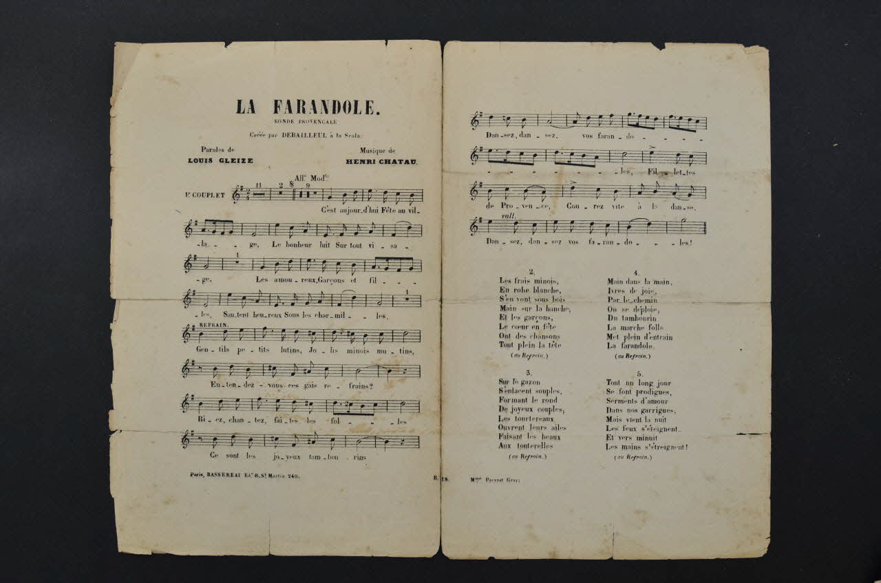Feuillet rectangulaire en papier industriel, imprimé à l?encre noire. La couverture du feuillet présente le dessin de personnages exécutant une farandole.
