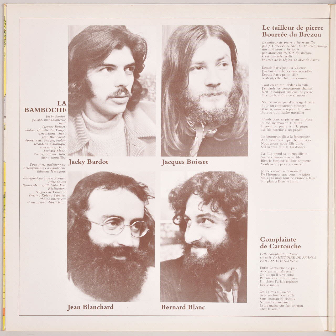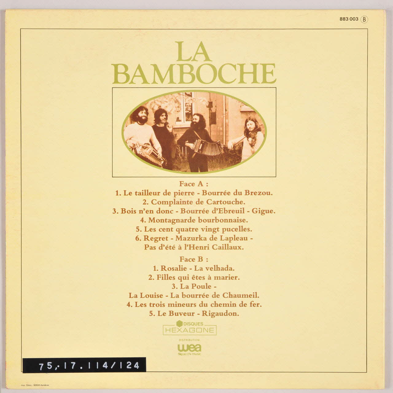 Au verso, une photographie noir et blanc d'un groupe de musiciens dans un ovale. Des inscriptions sur les deux faces de la pochette, et sur l'étiquette orange du disque renseignent les titres et les exécutants. A l'intérieur de la pochette, les paroles des chansons et la photographie des quatres membres du groupe "La Bamboche".Matériaux et techniques