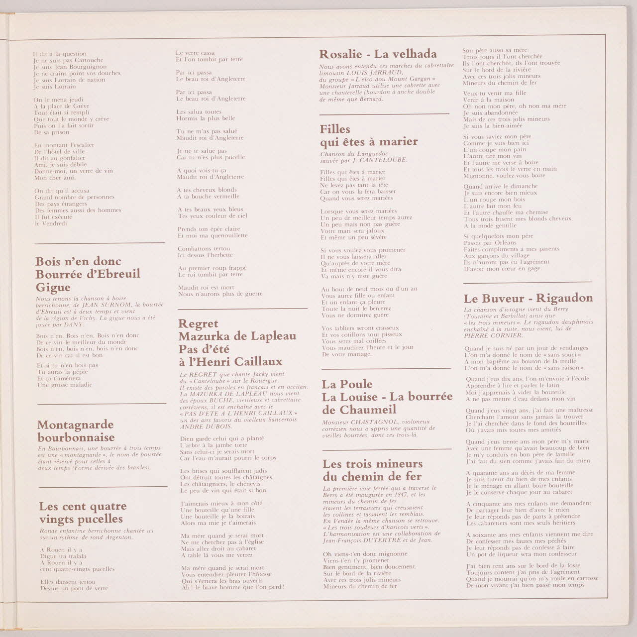 disque 33 tours, Montagnarde bourbonnaise, La Velhada, Le tailleur de pierre, Les cent quatre-vingts pucelles, Pas d'été à l'Henri Caillaux, Filles qui êtes à marier, Le buveur, La Bamboche, La bourrée de la Chaumeil, La Louise, Mazurka de Lapleau, Complainte de Cartouche, Rosalie, La Poule, Les trois mineurs du chemin de fer, Bois n'en donc