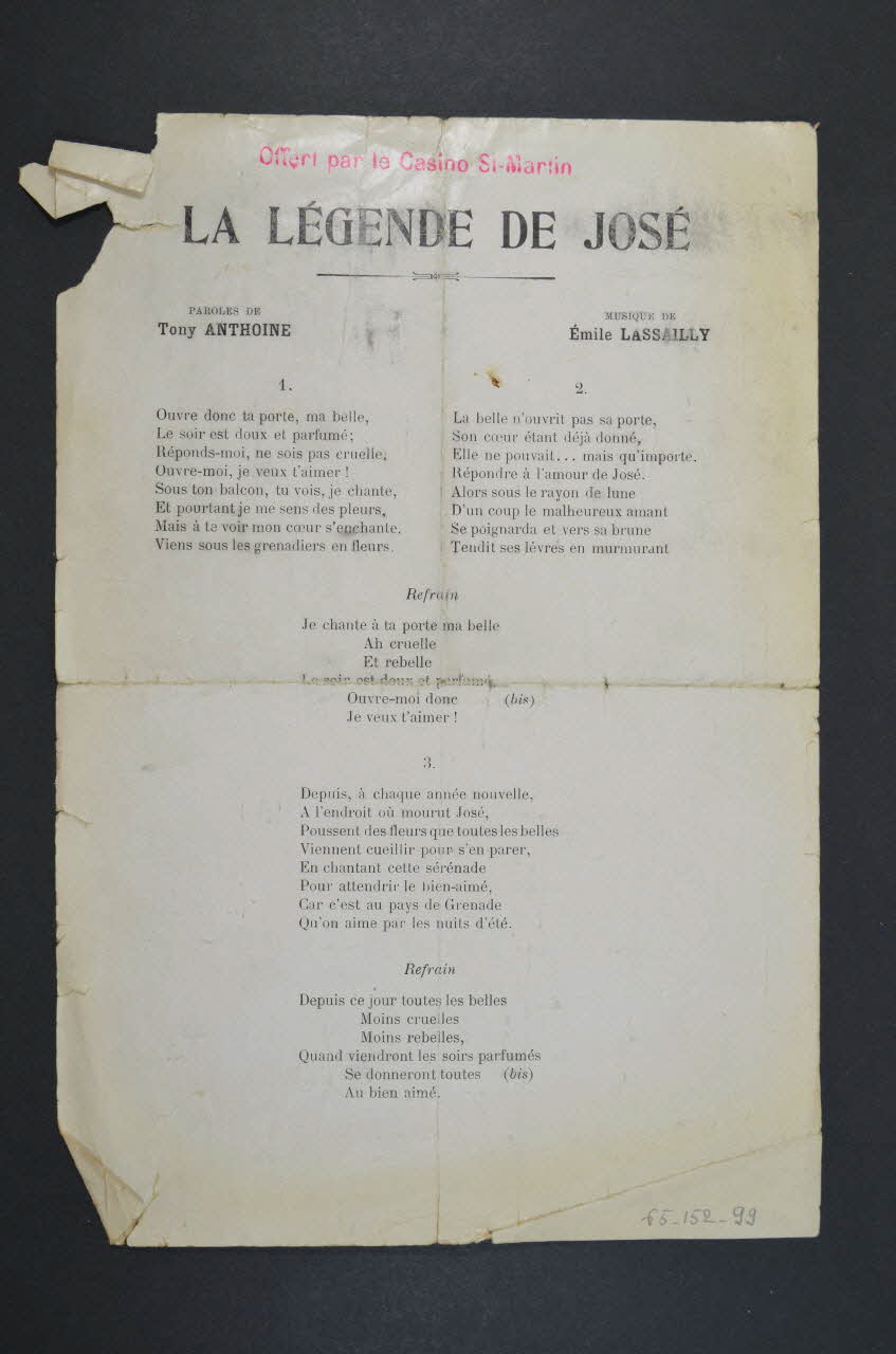 Feuillet rectangulaire en papier industriel imprimé. Le feuillet contient la partition et les paroles de la chanson. Au dos, publicité pour l'éditeur.