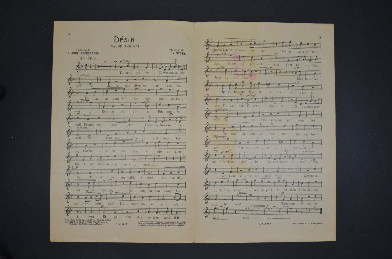 Les inscriptions renseignent le titre de la chanson, le nom des auteurs, de l'artiste et de l'éditeur. A l'intérieur, partitions et paroles de la chanson. Le dos est laissé vierge.Décor