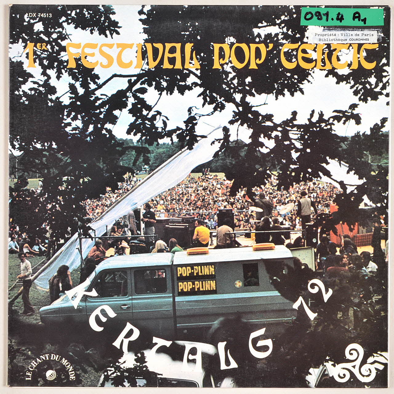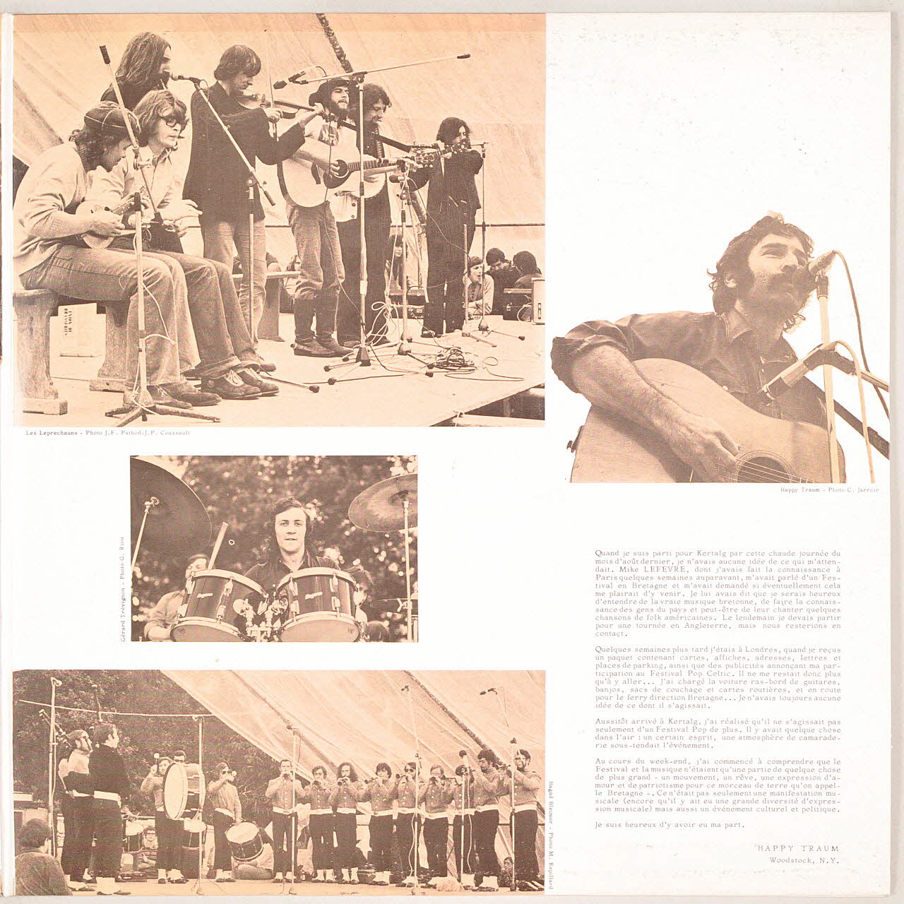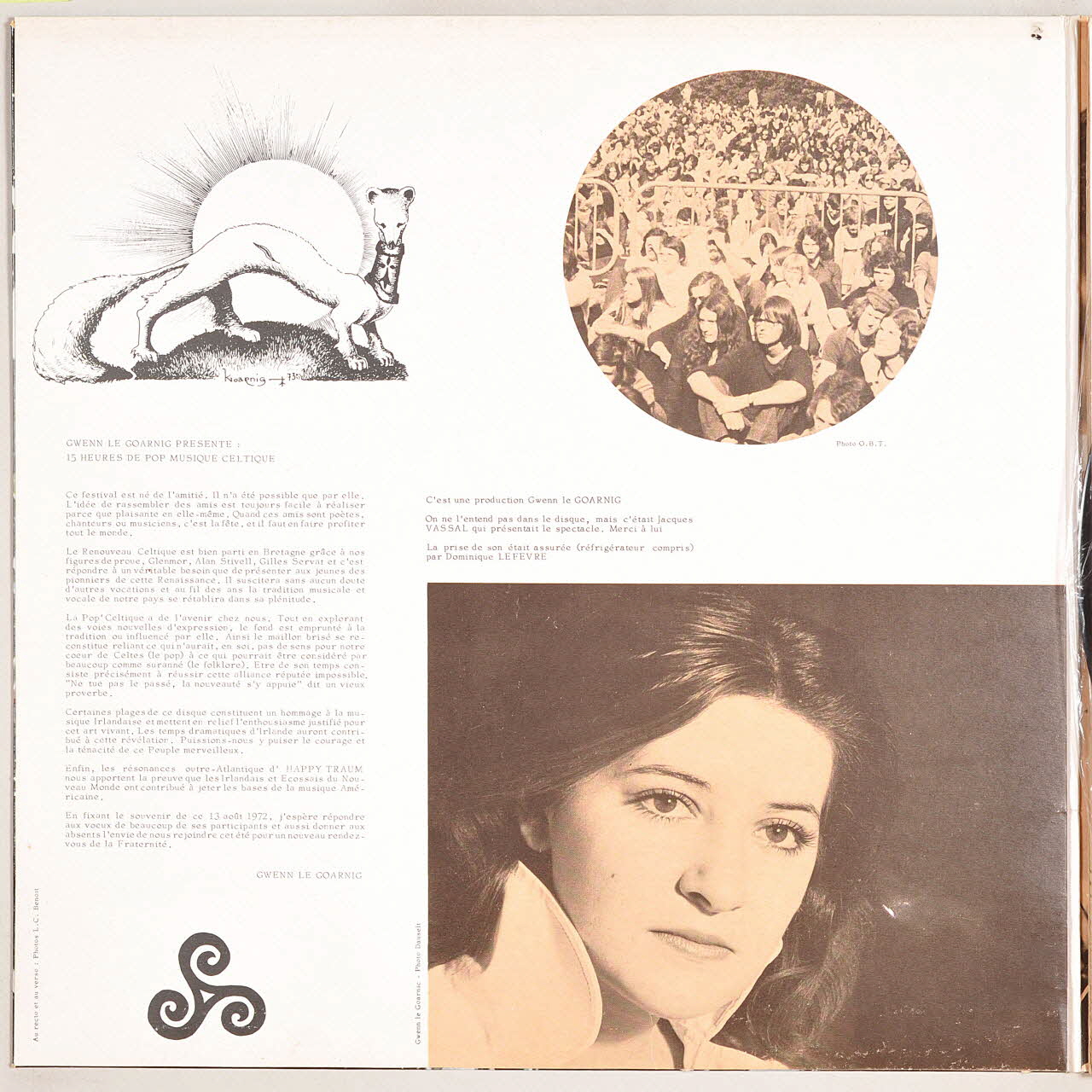 Le verso présente une photographie couleur du public du festival sur un fond de ciel nuageux. La pochette s'ouvre dans le sens horizontal en trois volets. Le volet de gauche contient un texte de Gwenn Le Goarnic, la productrice du festival, une photographie du visage de cette dernière, couleur sépia, une photographie sépia du public et un dessin d'une hermine devant un soleil. Sur les deux autres volets sont présentes des photographies sépia des diffférents groupes qui ont participé au festival et un texte de Happy Traum. Au verso du volet de droite sont présentes d'autres photographies sépia des participants, la liste des titres et un texte d'Alan Stivell. L'étiquette au centre du disque présente un fond orange sur lequel sont inscrits les titres et le logo de l'editeur.Inscriptions