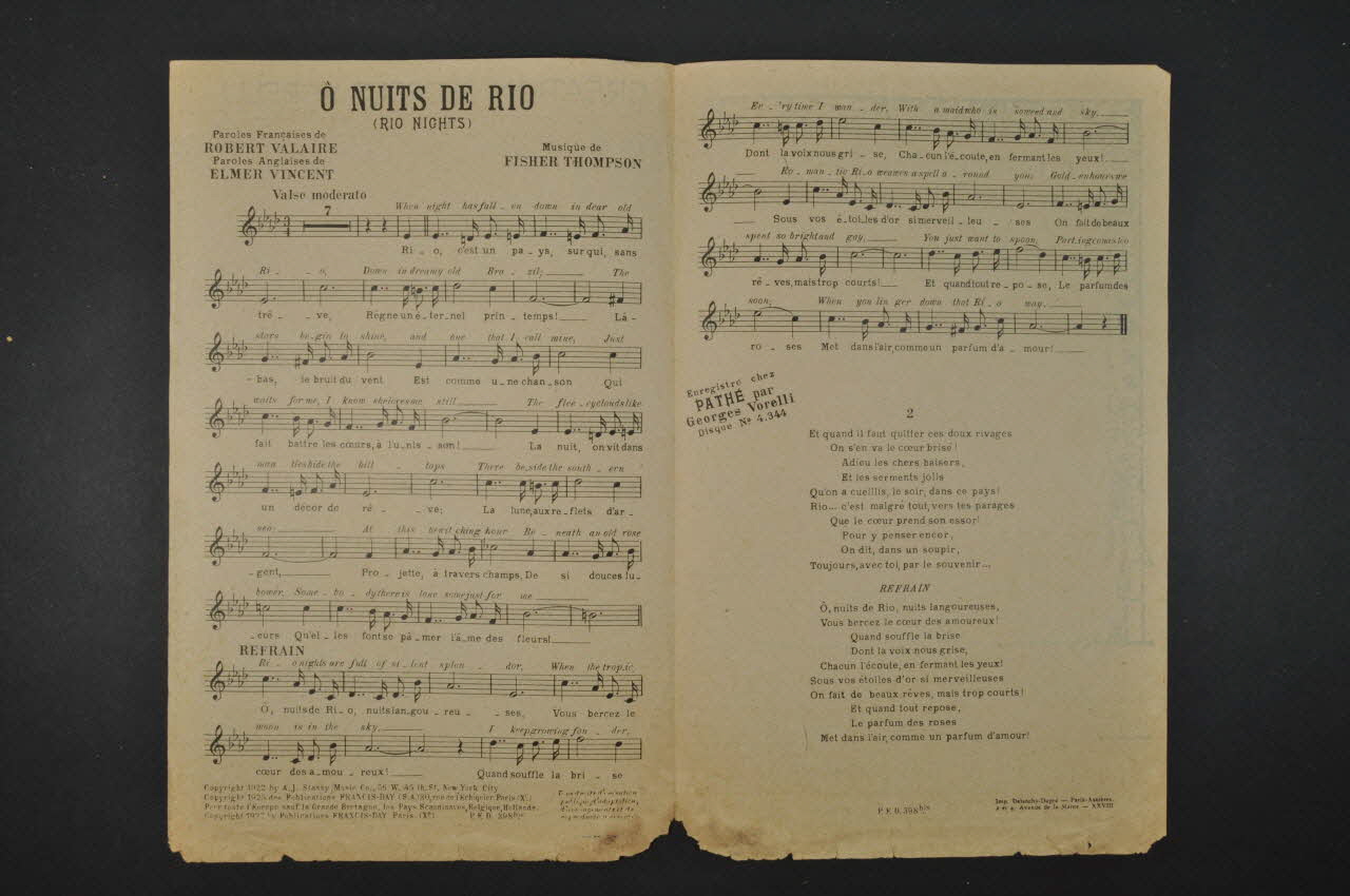 Des inscriptions renseignent le titre, les auteurs, les exécutants et l'éditeur. A l'intérieur, partition et paroles de la chanson. Au dos, liste d'autres partitions publiées par l'éditeur.Décor