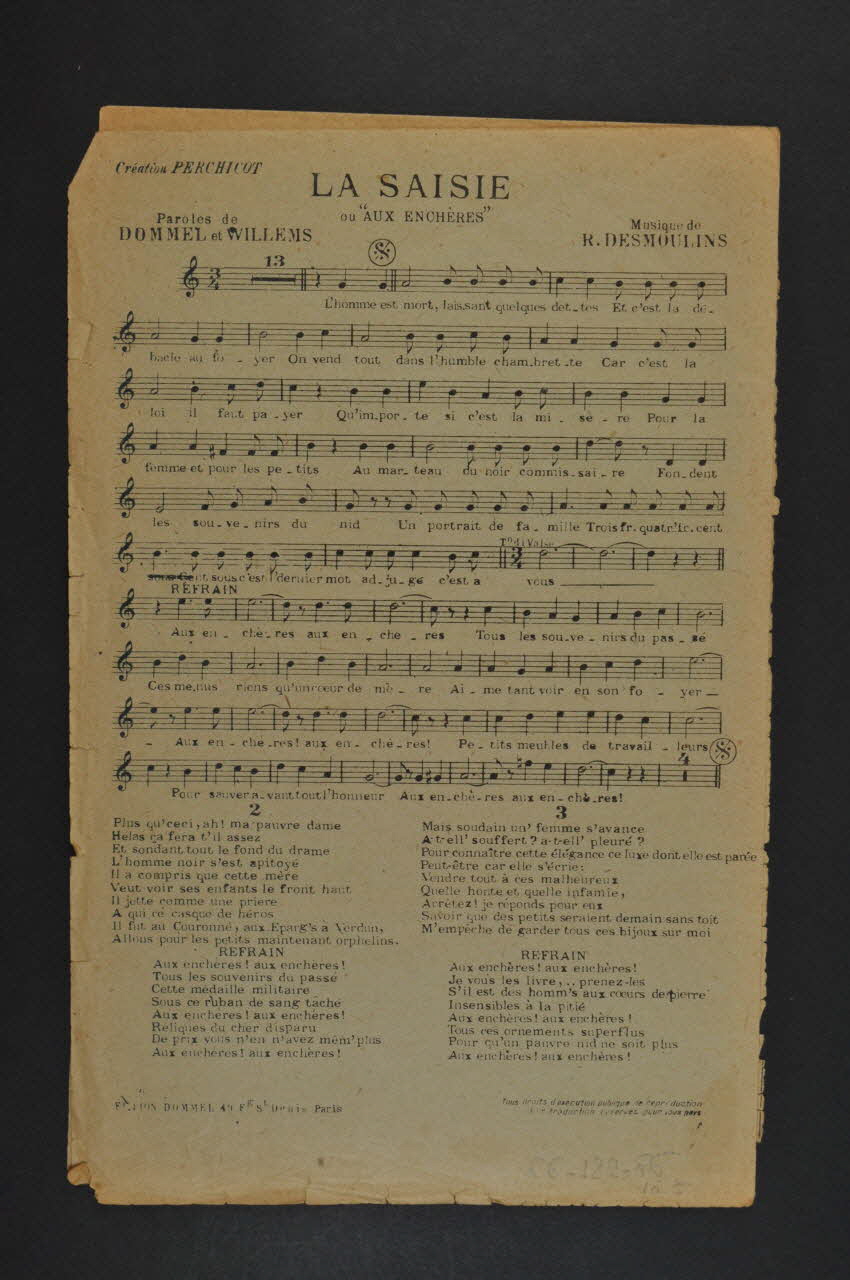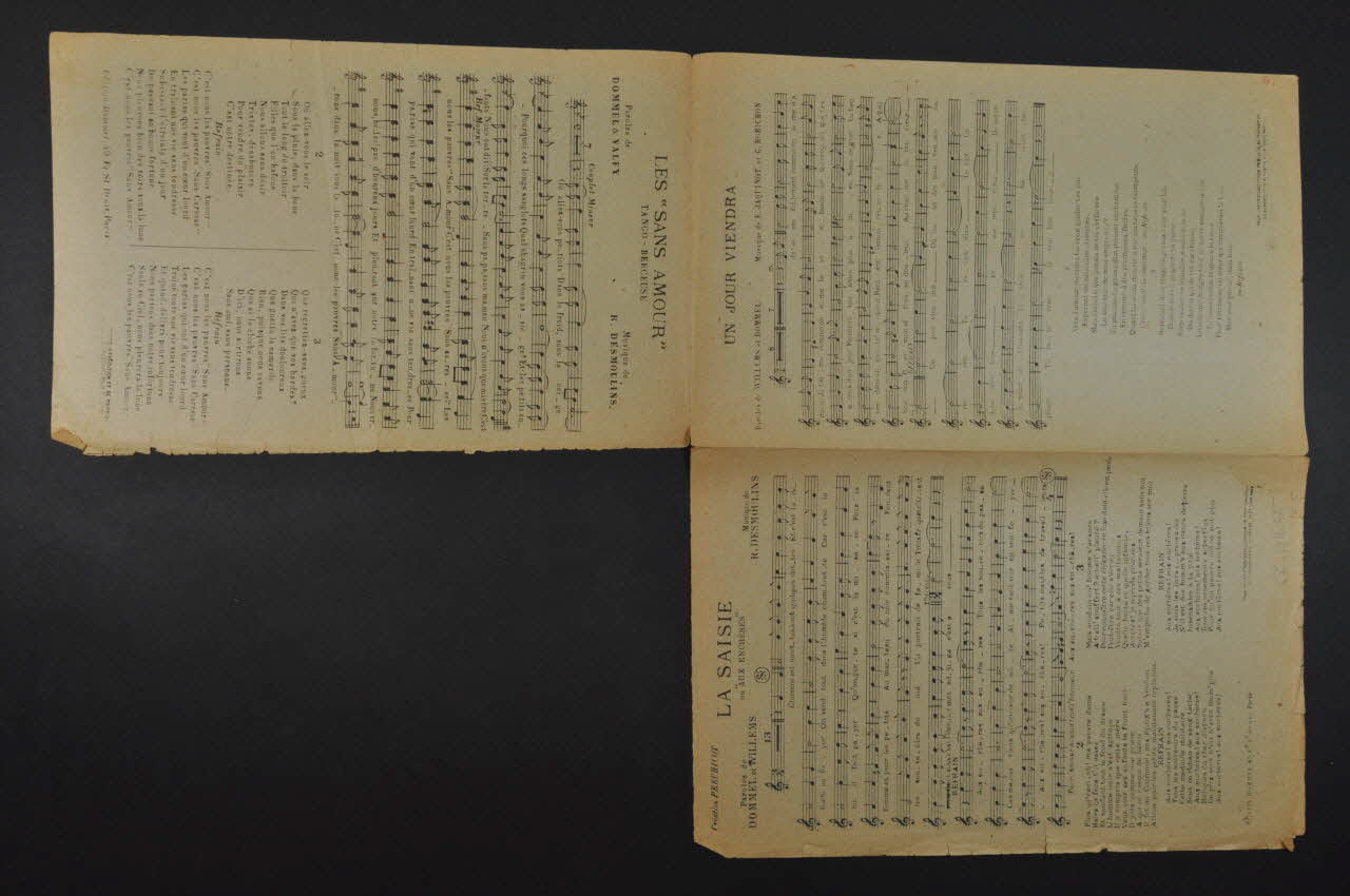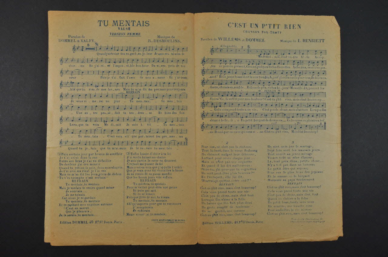 Les inscriptions renseignent le titre de la chanson, le nom des auteurs, de l'artiste et de l'éditeur. A l'intérieur et au dos, les partitions et les paroles des chansons.Décor