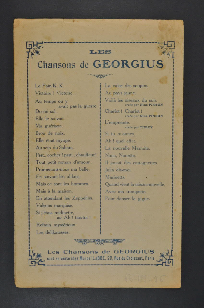 Des inscriptions renseignent le titre, les auteurs, les exécutants et l'éditeur. A l'intérieur, partition et paroles de la chanson. Au dos, liste d'autres partitions publiées par l'éditeur.Décor