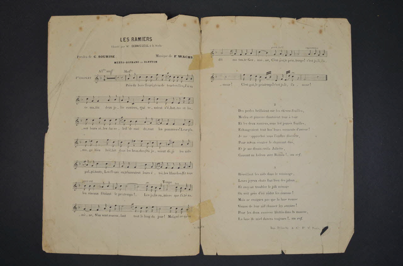 Les inscriptions renseignent le titre de la chanson, le nom des auteurs, de l'artiste et de l'éditeur. A l'intérieur, partitions et paroles de la chanson. Le dos est laissé vierge.Matériaux et techniques