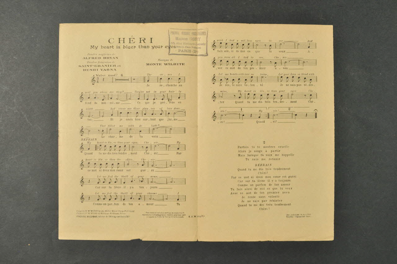 Des inscriptions renseignent le titre, les auteurs, les exécutants et l'éditeur. A l'intérieur, partition et paroles de la chanson. Au dos, liste d'autres partitions publiées par l'éditeur.Décor