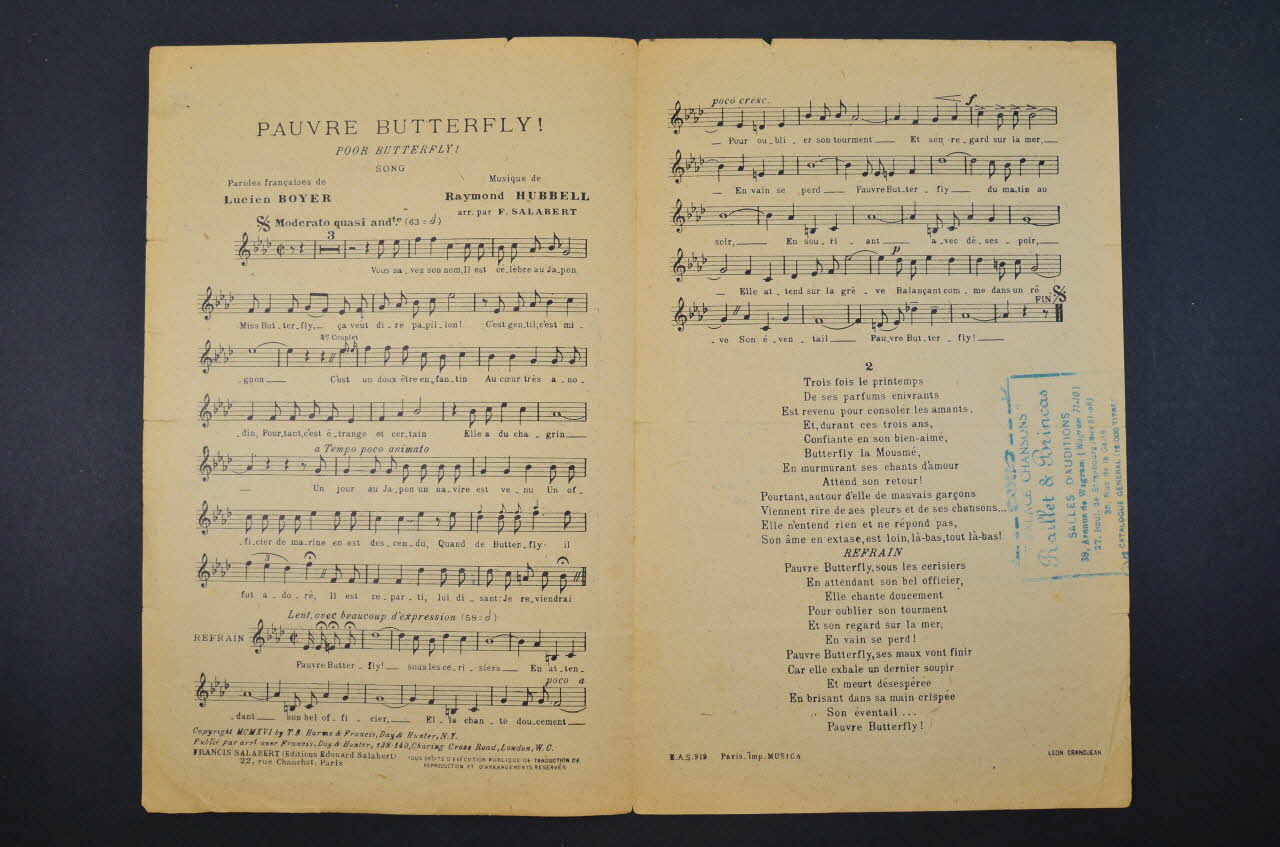 Feuillet rectangulaire en papier industriel imprimé. Le feuillet contient la partition et les paroles de la chanson. Au dos, publicité pour l'éditeur.
