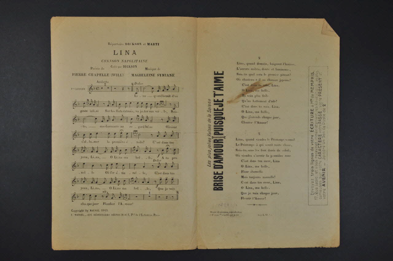 Les inscriptions renseignent le titre de la chanson, le nom des auteurs, de l'artiste et de l'éditeur. A l'intérieur, partitions et paroles de la chanson. Au dos, liste d?autres partitions publiées par l?éditeur.Matériaux et techniques