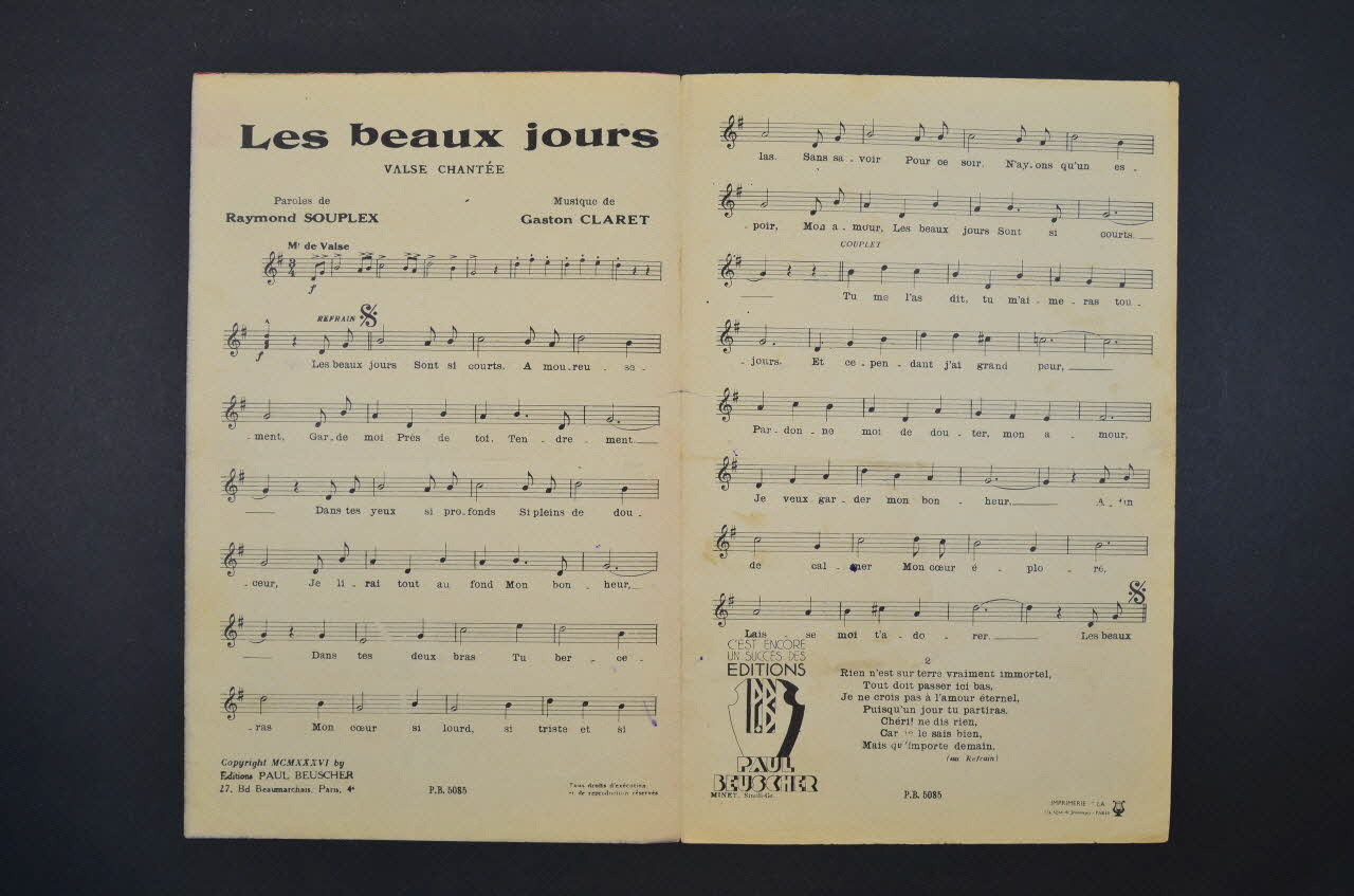 Sur la couverture, le portrait photographique de Tino Rossi inscrit dans une représentation de la carte de France. Les inscriptions renseignent le titre de la chanson, le nom des auteurs, de l'artiste et de l'éditeur. A l'intérieur, partition et paroles de la chanson. Au dos, liste d'autres partitions publiées par l'éditeur.Décor
