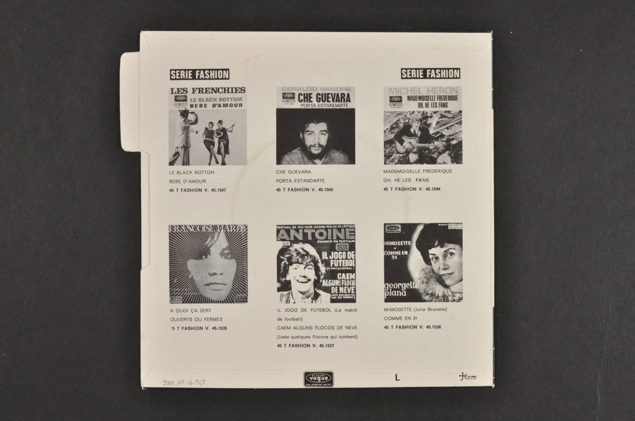 Le verso présente un fond noir et la photographie en couleur du groupe. Y figurent les titres des chansons, le nom du groupe, les noms des compositeurs et le logo de l'éditeur. Au dos, sur un fond blanc se trouvent les reproductions en noir et blanc de disques du même éditeur accomagnées d'inscriptions noires.Matériaux et techniques