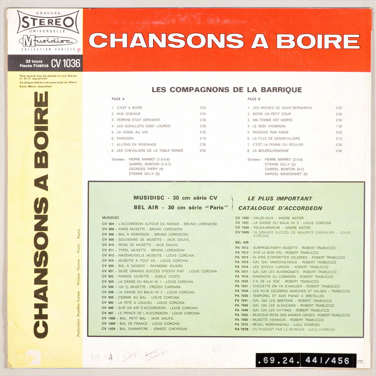 En partie supérieure, liste des titres. Au dos, présentation des titres et d'autres albums de la collection. Au centre du disque, sur les deux faces, une étiquette circulaire en papier imprimé de couleur blanche avec une écriture noire renseignant les titres, auteurs, exécutants et éditeur.Décor