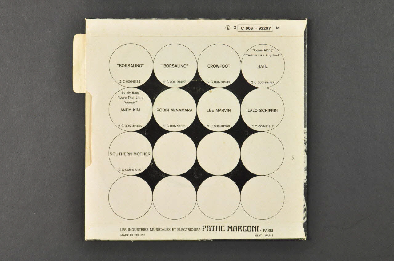 Il est conservé dans une pochette .2 en papier de forme carrée. La face avant est illustrée d'une photographie en noir et blanc d'un couple s'embrassant. Des inscriptions rouges sont présentes en haut et en bas de l'image. Une petite languette prédécoupée dépasse du haut du bord droit ; elle reprend en noir les informations principales sur le disque. L'arrière est blanc avec des titres d'autres disques, en noir dans des cercles noirs accolés.Matériaux et techniques