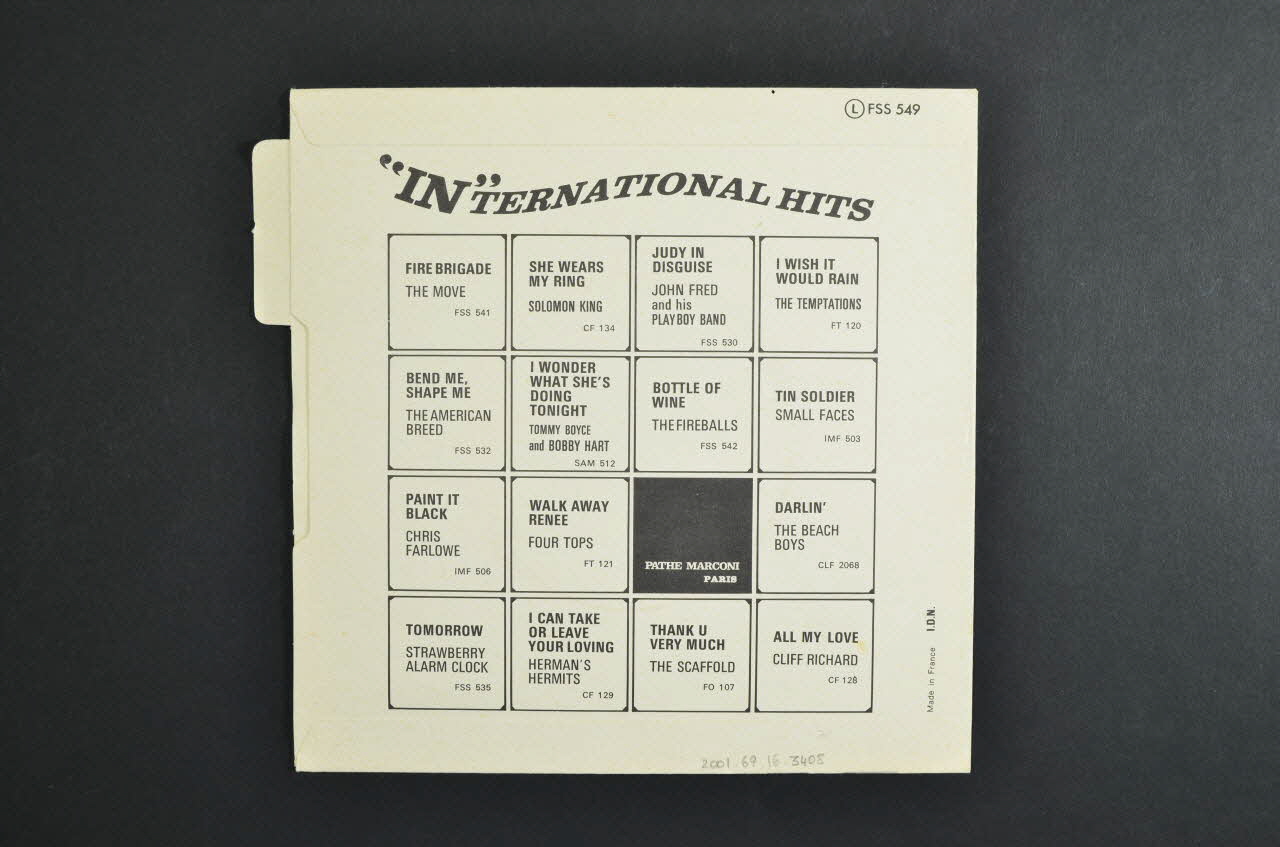 De forme carrée, la pochette est en papier, pliée et collée. Les inscriptions sont en anglais. Une étiquette saillante se trouve au niveau supérieur du bord droit.