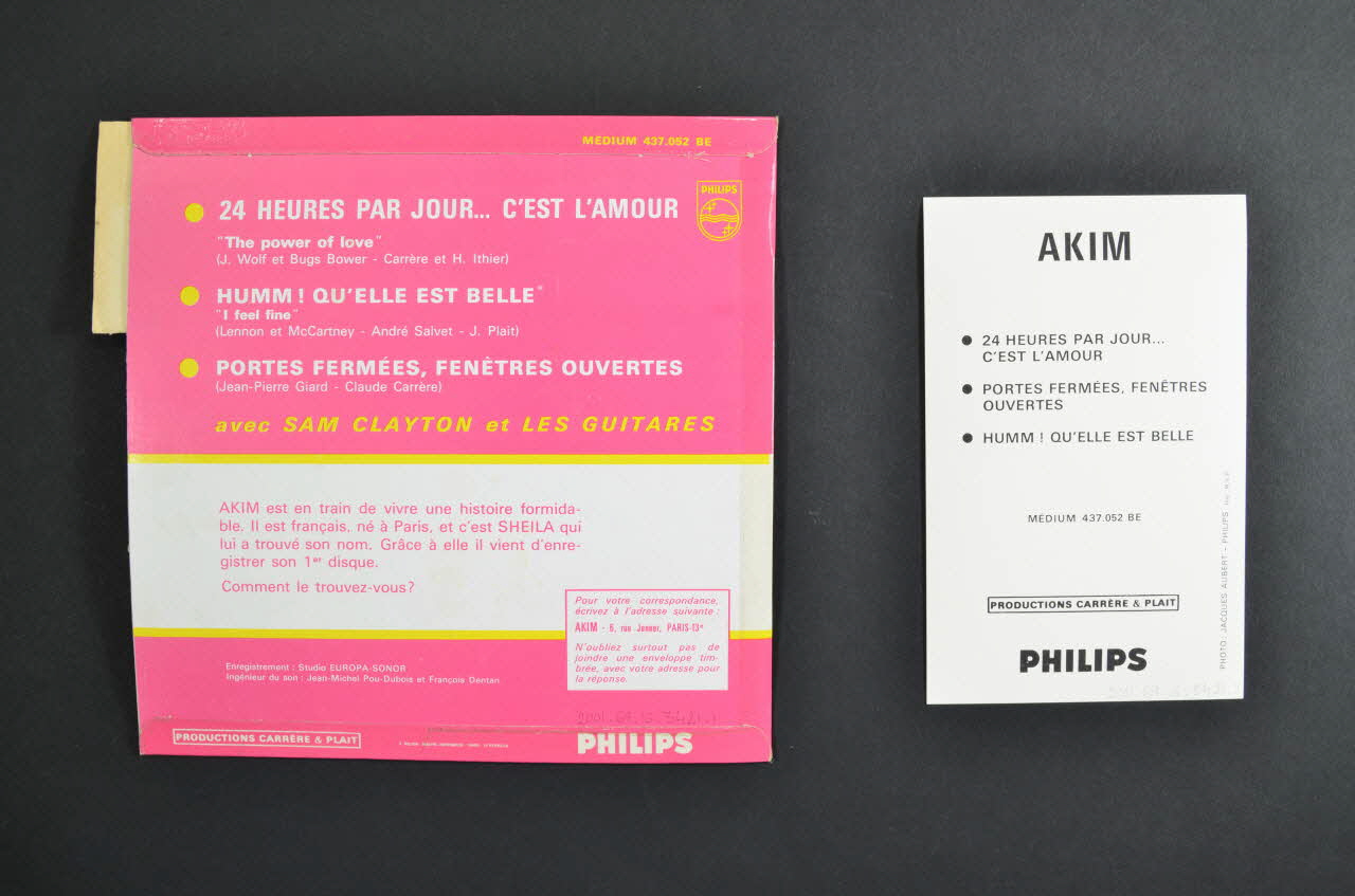 Cette pochette de disque .1 en papier cartonné présente une forme carrée. La face avant, plastifiée, est rose avec le nom du chanteur en lettres roses sur rectangles jaunes et blancs, les titres en blanc et une indication sur bandeau jaune en bas. Une petite languette prédécoupée est présente en haut du bord droit ; elle porte les informations principales sur le disque en rose sur blanc.