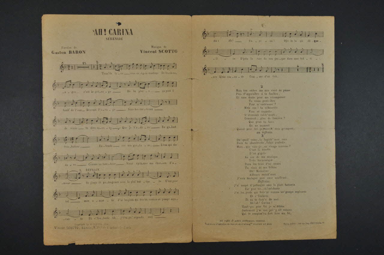 Sur la couverture, les portraits photographiques en médaillon de Charlotte Valdor et Pélissier. Les inscriptions renseignent le titre de la chanson, le nom des auteurs, des artistes et de l'éditeur. A l'intérieur, partition et paroles de la chanson. Au dos, portrait photographique de Vincent Scotto et liste d'autres partitions de son répertoire publiées par l'éditeur.Matériaux et techniques