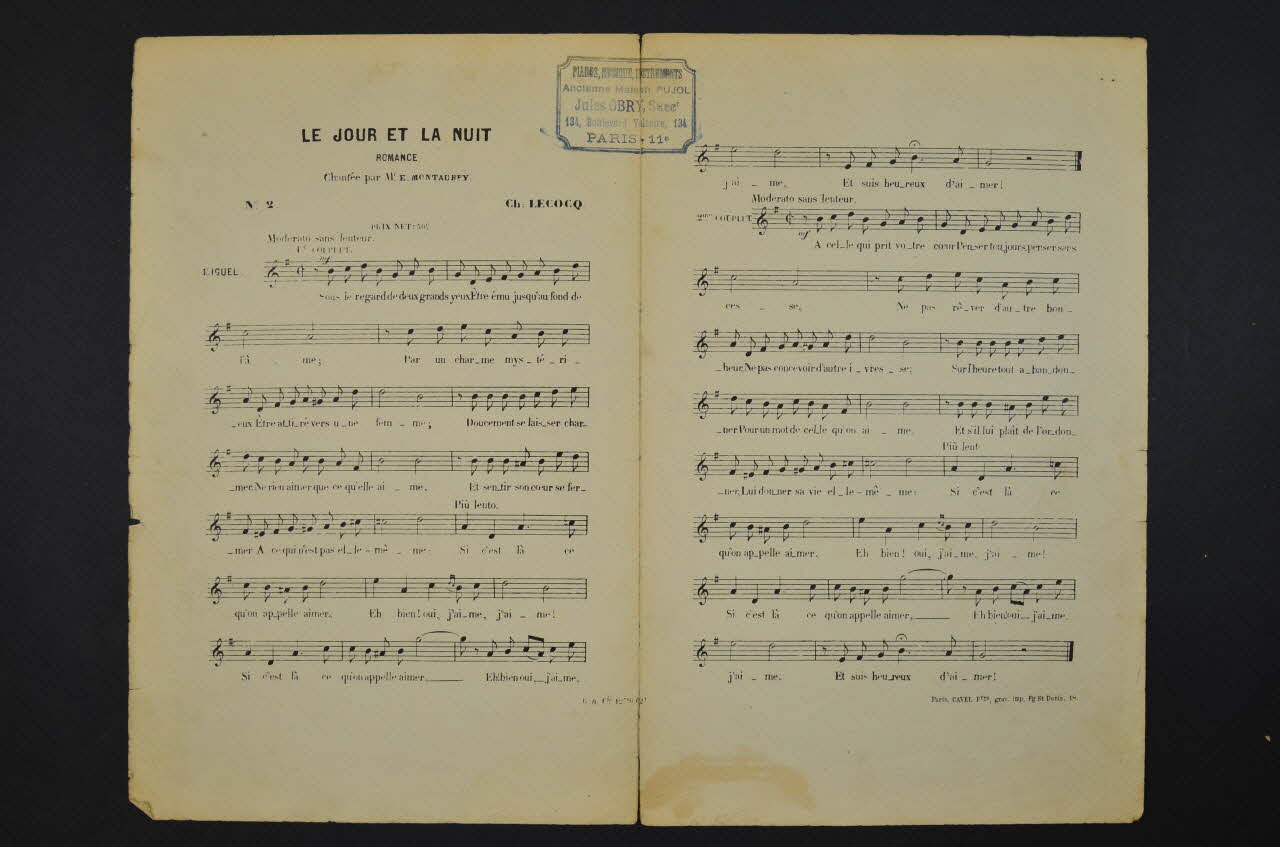 Les inscriptions précisent l'auteur de la chanson, les interprètes et l'éditeur du feuillet. L'intérieur comporte la partition et les paroles. Au dos, une liste d'autres titres disponibles chez le même éditeur.Décor