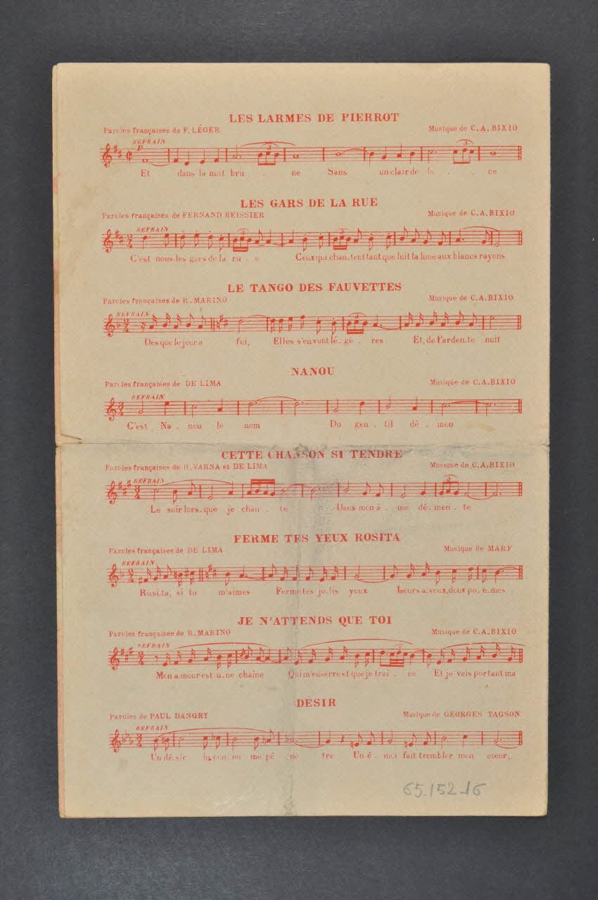 Feuillet rectangulaire en papier industriel imprimé à l'encre rouge (sauf à l'intérieur, encre noire). Sur la couverture, un portrait photographique de Lys Gauty.