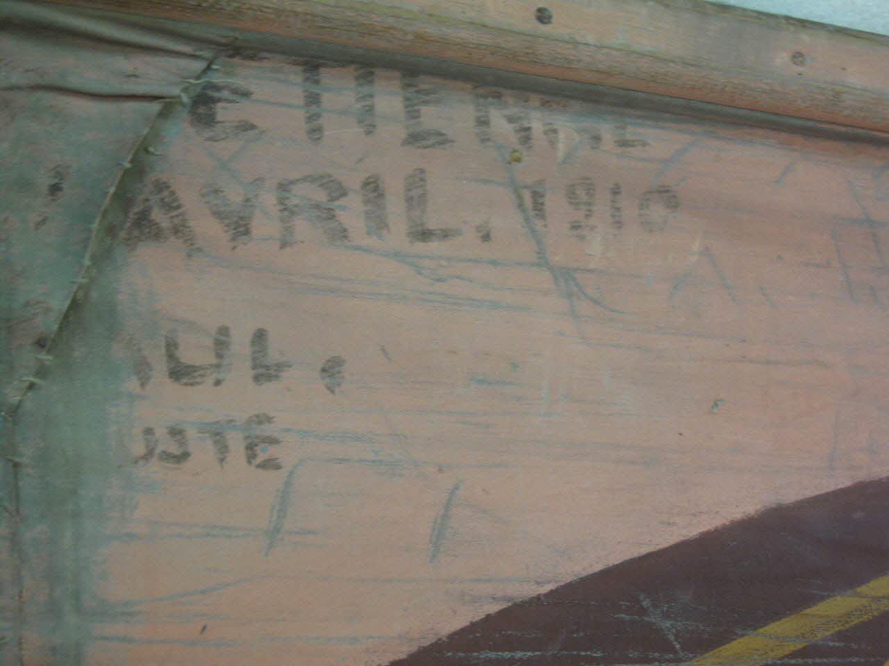 toile peinte à la colle, fixée aux extrémités entre deux baguettes de suspension en bois clouées entre elles ; esquisse au fusain / Latoile de fond représente sur le recto le cirque utilisé pour "les cinq sous de Lavarède". Sous un chapiteau rouge et or, des spectateurs chapeautés sont assis sur des gradins. Au verso, une scène esquissée au fusain présente la garde nationale qui fait barrière devant la foule, tandis que deux hommes sont perchés dans les arbres (le cirque qui passe dans la rue ?).Décor