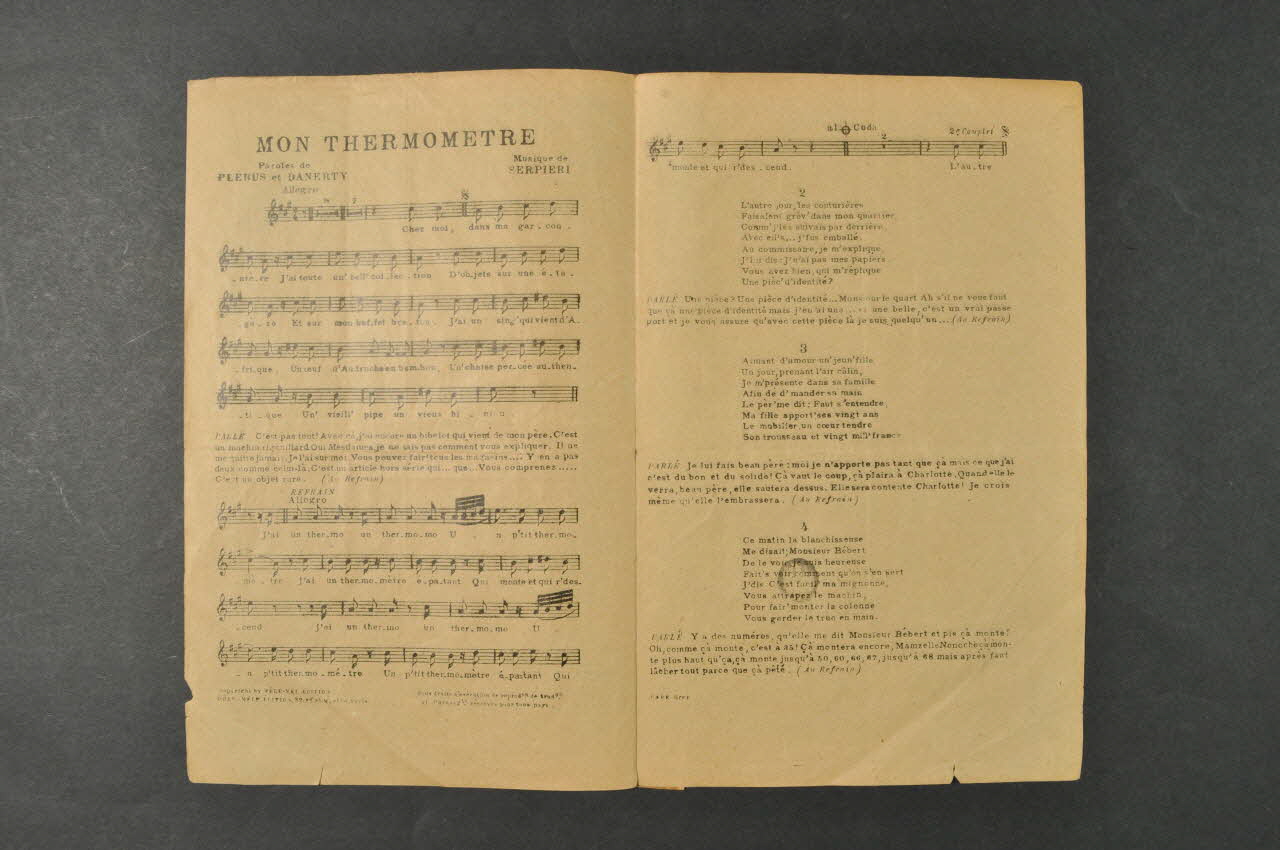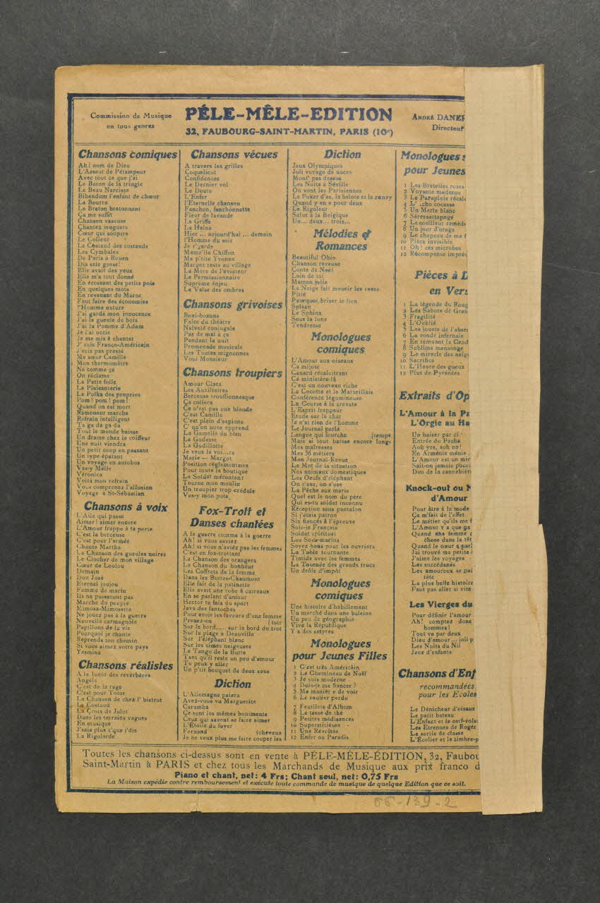 Des inscriptions renseignent le titre, les auteurs, les exécutants et l'éditeur. A l'intérieur, partition et paroles de la chanson. Au dos, liste d'autres partitions publiées par l'éditeur.Décor