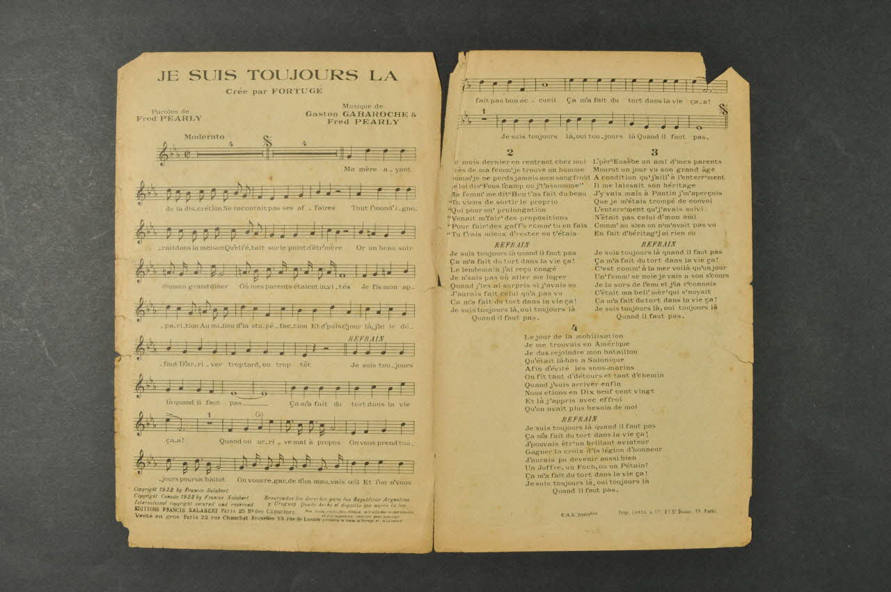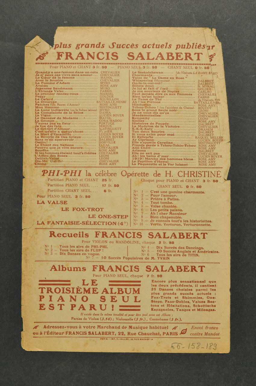 Les inscriptions renseignent le titre de la chanson, le nom des auteurs, de l'artiste et de l'éditeur. A l'intérieur, partitions et paroles de la chanson. Au dos, liste d?autres partitions publiées par l?éditeur.Décor