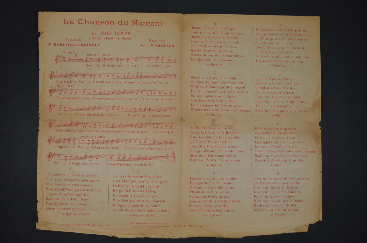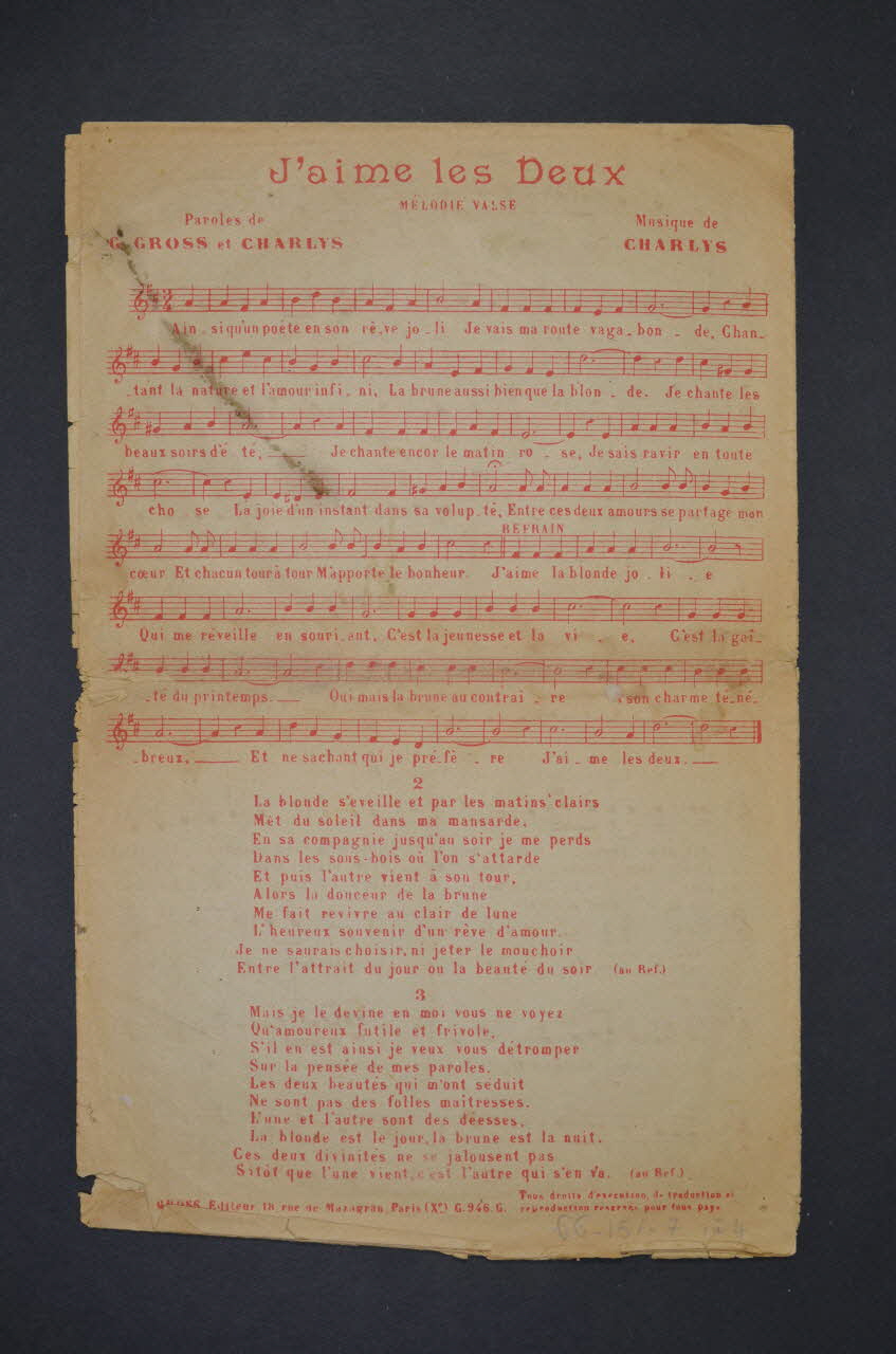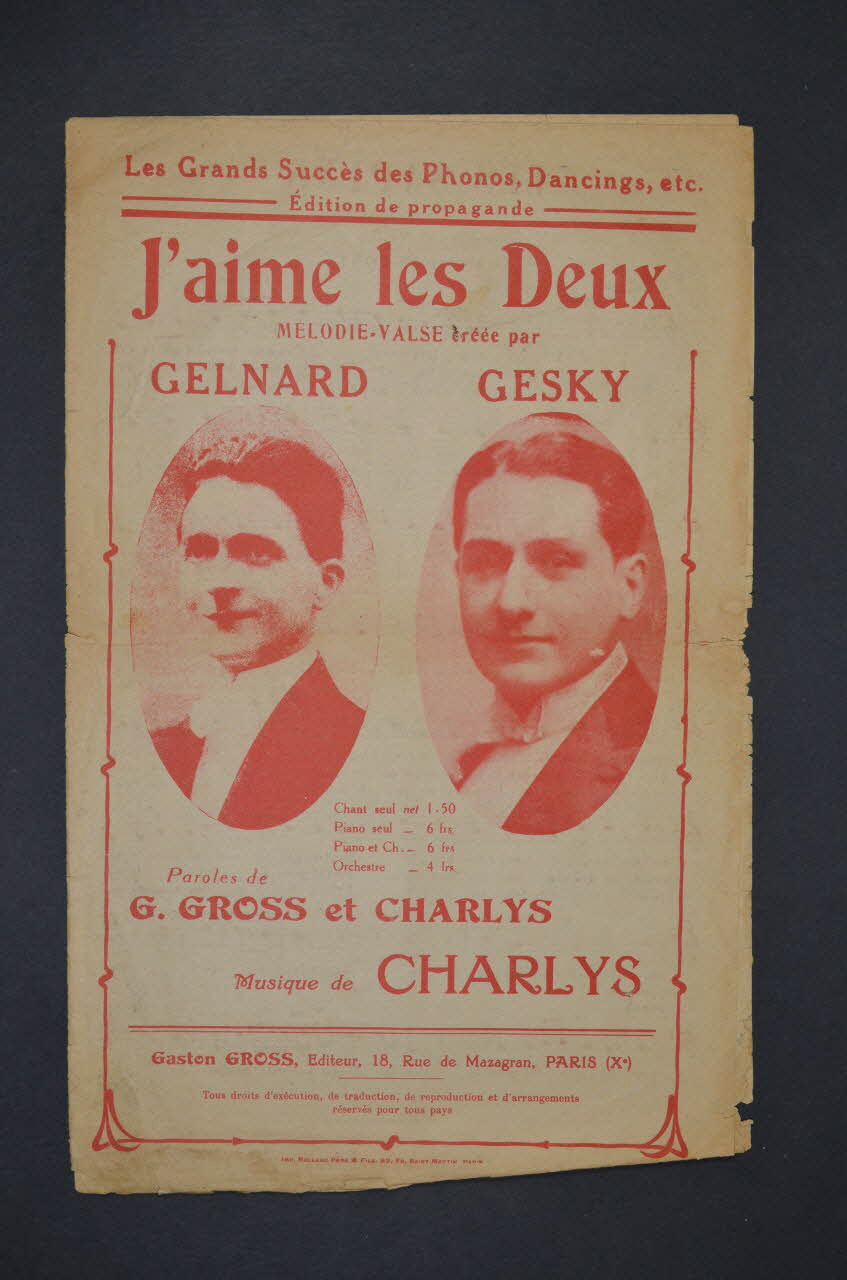 Sur la couverture, les portraits photographiques de Gelnard et Gensky. Les inscriptions renseignent le titre de la chanson, le nom des auteurs, des artistes et de l'éditeur. A l'intérieur et au dos, partition et paroles des chansons.Décor