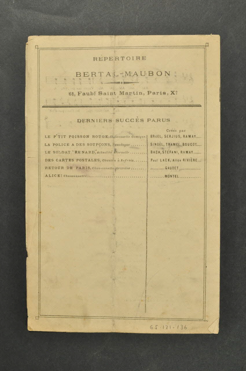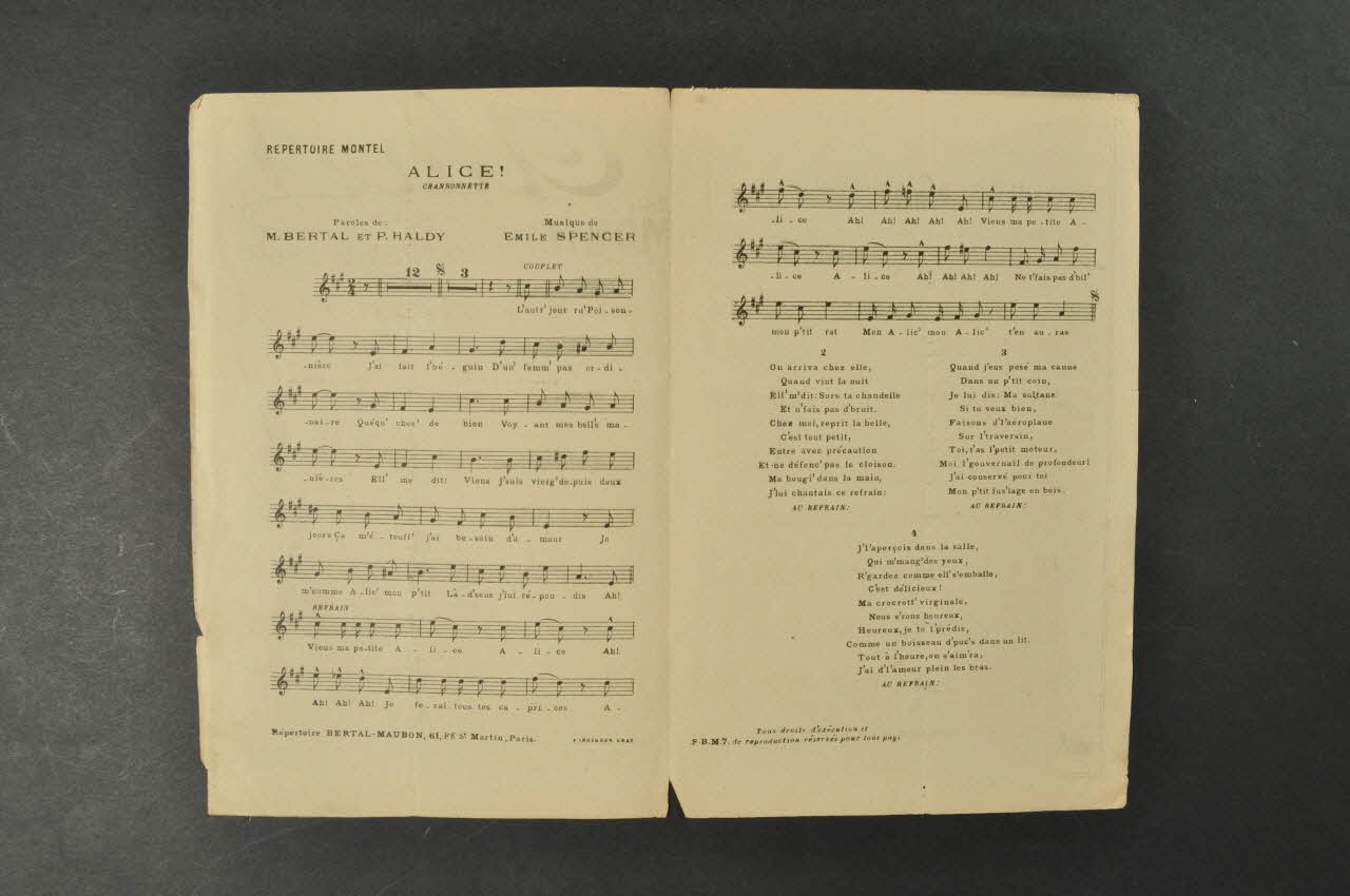 Des inscriptions renseignent le titre, les auteurs, les exécutants et l'éditeur. A l'intérieur, partition et paroles de la chanson. Au dos, liste des succès de Bertal-Maubon.Matériaux et techniques