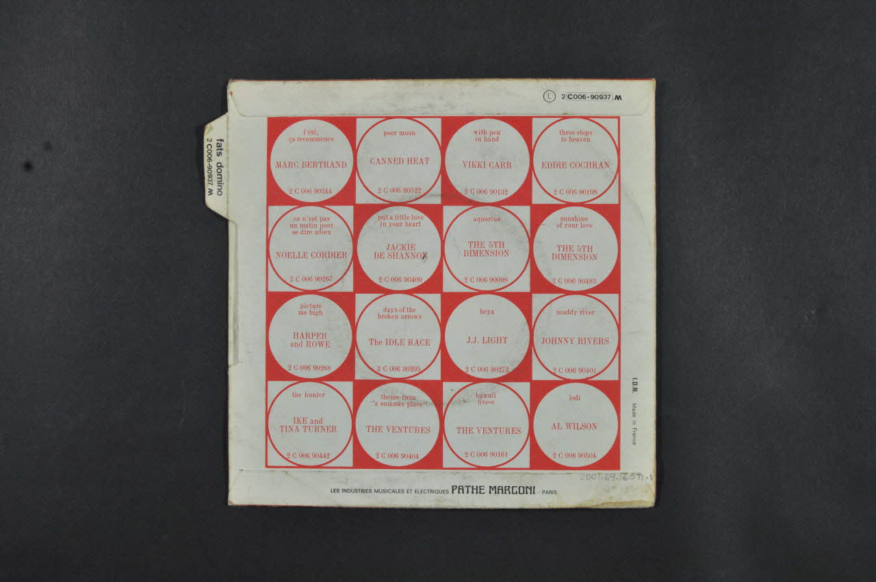 Le recto est sur fond rouge, et est illlustré d'une photographie en noir et blanc représentant un homme chantant dans un micro. Dans la partie supérieure figure le titre des chansons en noir et blanc et le nom de l'interprète. Dans l'angle supérieur gauche figure le logo de la maison de disque. Au dos, sont imprimés des cercles sur fond rouge et blanc. La pochette contient un disque vinyle (.2) avec une étiquette rouge portant des inscriptions en noir des deux côtés.Matériaux et techniques