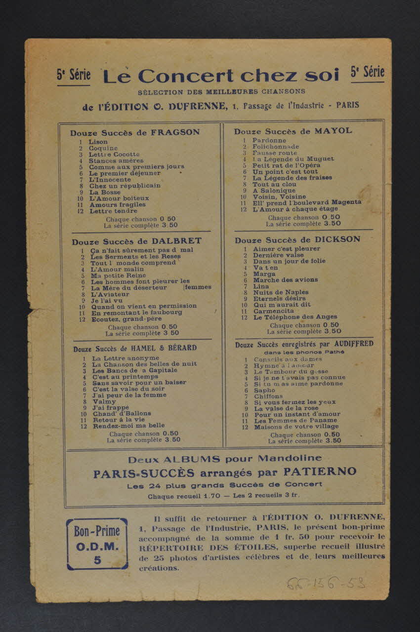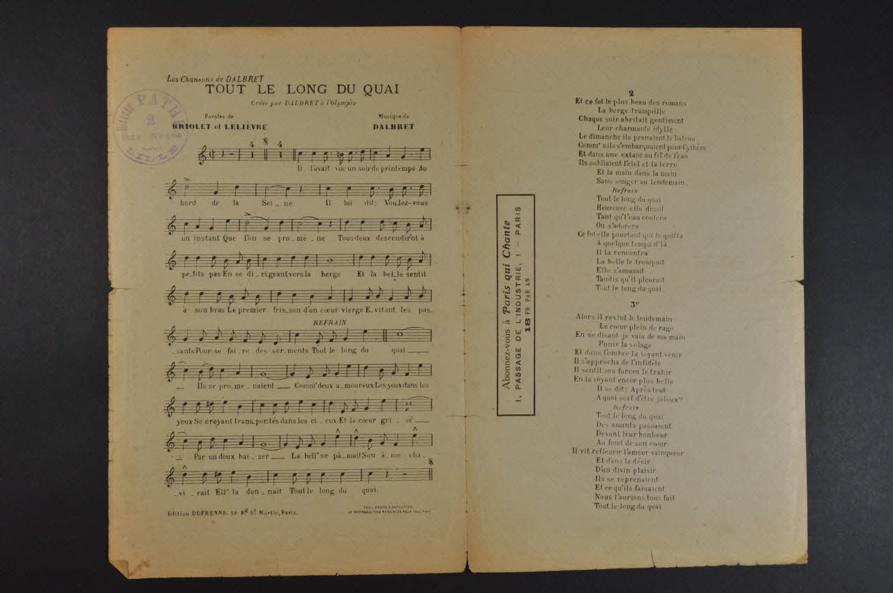 Les inscriptions renseignent le titre de la chanson, le nom des auteurs, de l'artiste et de l'éditeur. A l'intérieur, partitions et paroles de la chanson. Au dos, liste d?autres partitions publiées par l?éditeur.Décor