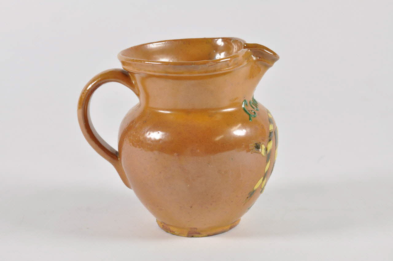 Argile rouge, façonnée au tour, à glaçure brun jaune, à décor au pinceau / En argile rouge, montée au tour, sur plan circulaire, à légère inflexion à la base. La panse galbée présente un décor central d'un écu noir avec une croix jaune, inscrit dans un cable circulaire noir et jaune. Au dessus figure une inscription.