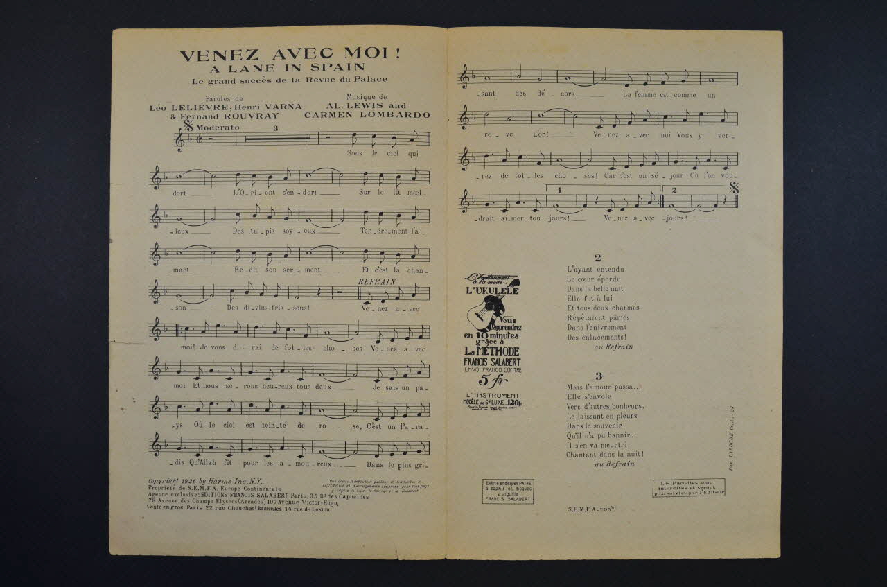 Des inscriptions renseignent le titre, les auteurs, les exécutants et l'éditeur. A l'intérieur, partition et paroles de la chanson. Au dos, liste d'autres partitions publiées par l'éditeur.Décor