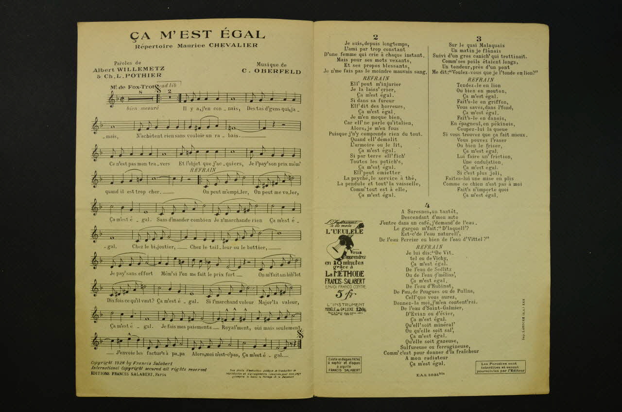 Les inscriptions renseignent le titre de la chanson, le nom des auteurs, de l'artiste et de l'éditeur. A l'intérieur, partitions et paroles de la chanson. Au dos, liste d?autres partitions publiées par l?éditeur.Inscriptions