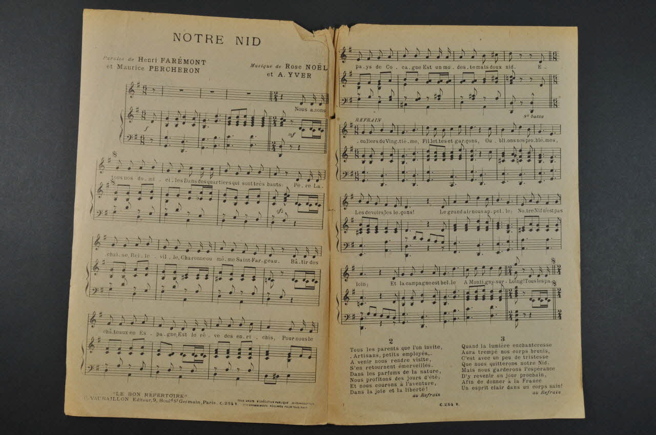 Sur la couverture, représentation de trois jeunes gens en chemise et bermuda, marchant en ligne sur une route bordée de sapins et se tenant par l'épaule ; à droite, oiseau près de son nid, à l'arrière-plan, porte de ville. Les inscriptions renseignent le titre de la chanson, le nom des auteurs et de l'éditeur.