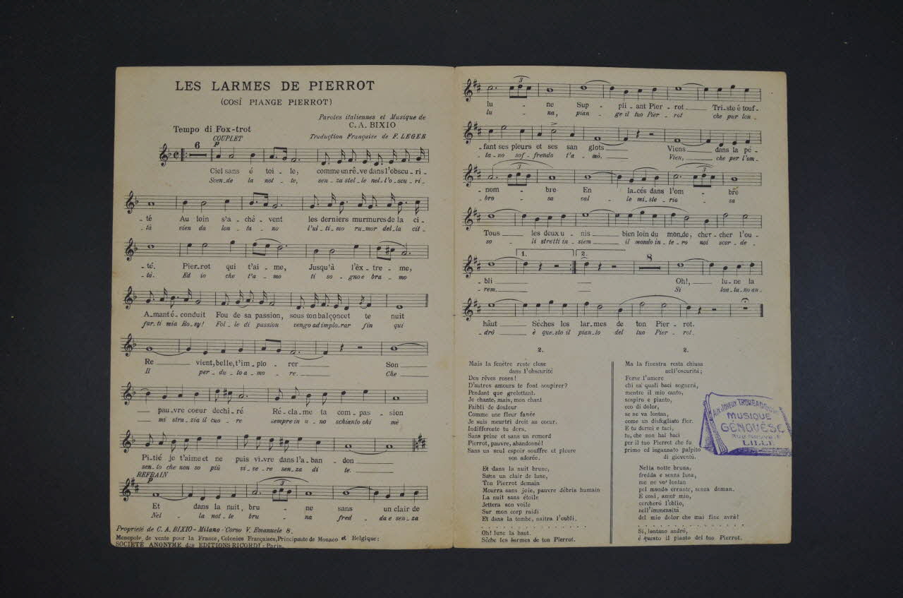 Feuillet rectangulaire en papier industriel. La couverture du feuillet présente la photographie de Bixio et le dessin de Pierrot pleurant.