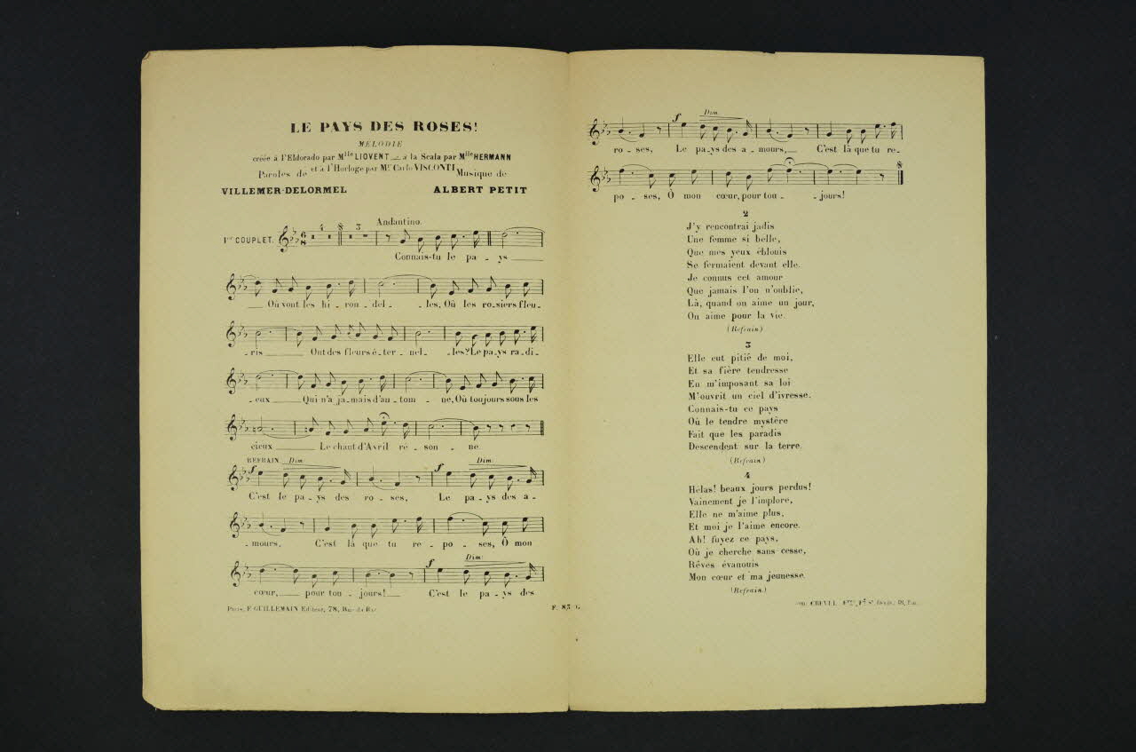 Les inscriptions renseignent le titre de la chanson, le nom des auteurs, de l'artiste et de l'éditeur. A l'intérieur, partition et paroles de la chanson. Le revers est laissé vierge.Matériaux et techniques