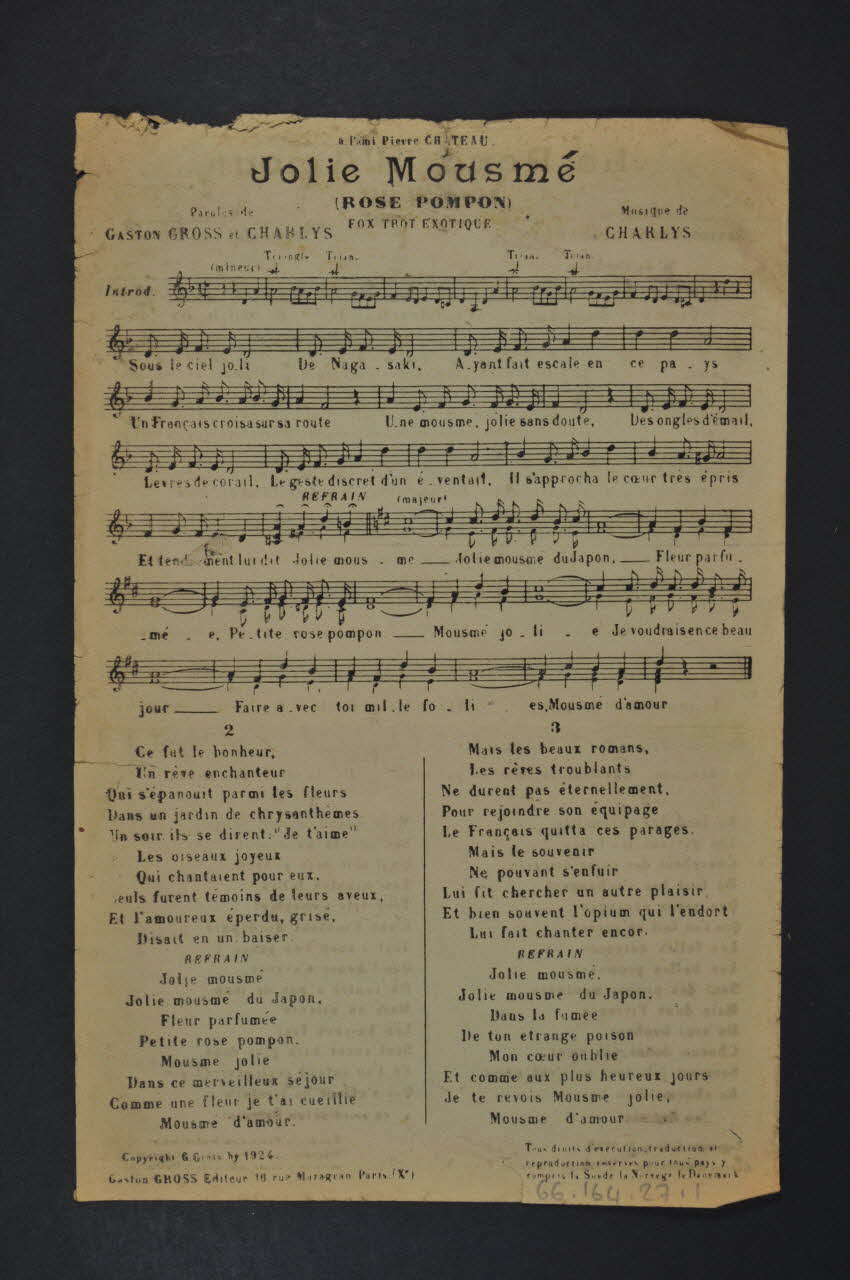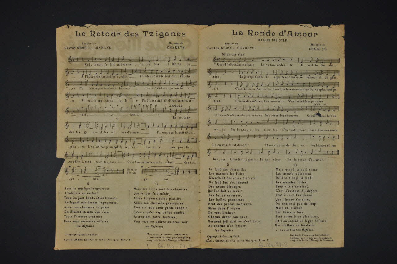 Des inscriptions renseignent les titres, les auteurs, les exécutants et l'éditeur. A l'intérieur et au dos, partitions et paroles des chansons.Décor