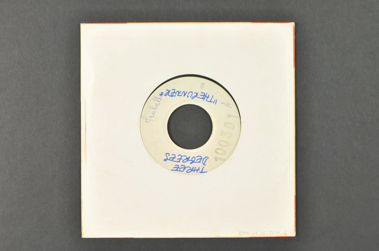 Le disque .1 en vinyle noir présente une forme circulaire avec évidement central. Des étiquettes de papier blanc portant des inscriptions manuscrites concernant les titres et l'artiste sont collées sur les deux faces, autour de l'évidement.
