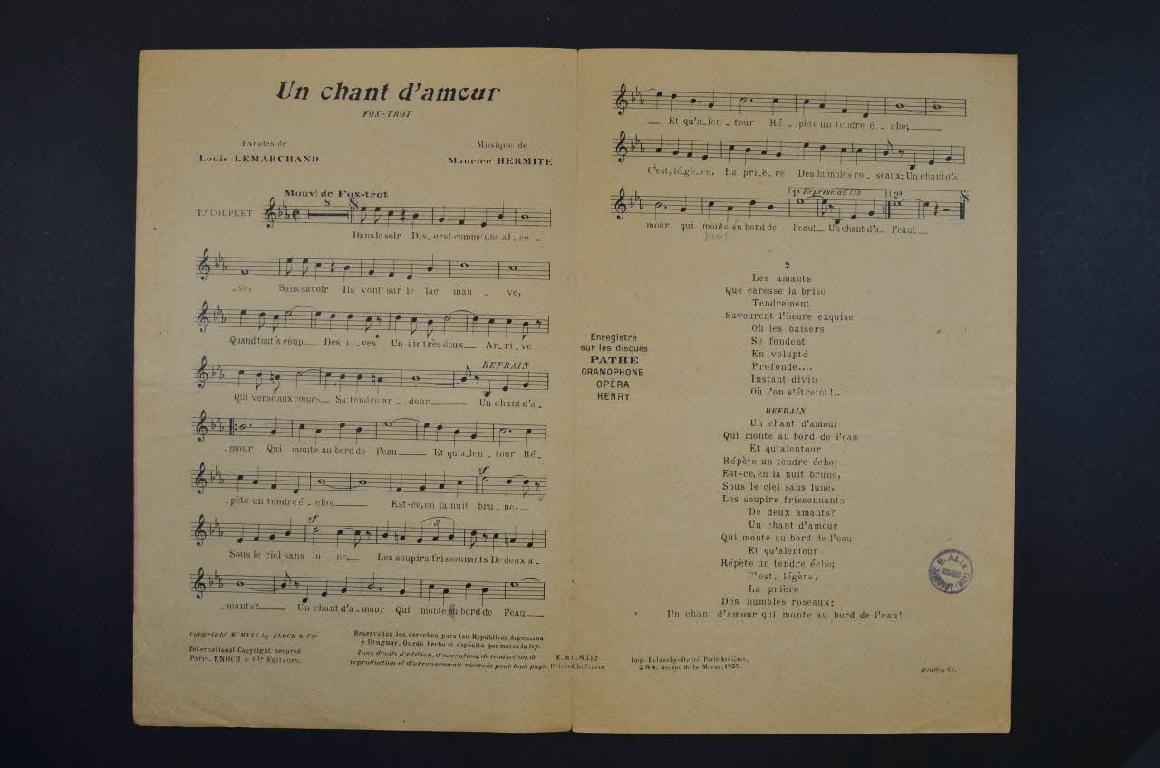 Les inscriptions renseignent le titre de la chanson, le nom des auteurs, de l'artiste et de l'éditeur. A l'intérieur, partitions et paroles de la chanson. Au dos, liste d?autres partitions publiées par l?éditeur.Matériaux et techniques