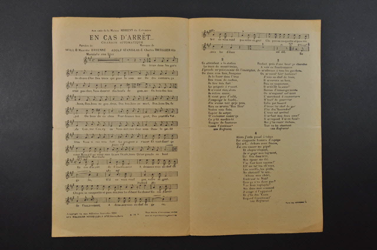 Des inscriptions renseignent le titre, les auteurs, les exécutants et l'éditeur. A l'intérieur, partition et paroles de la chanson. Au dos, liste d'autres partitions publiées par l'éditeur.Décor