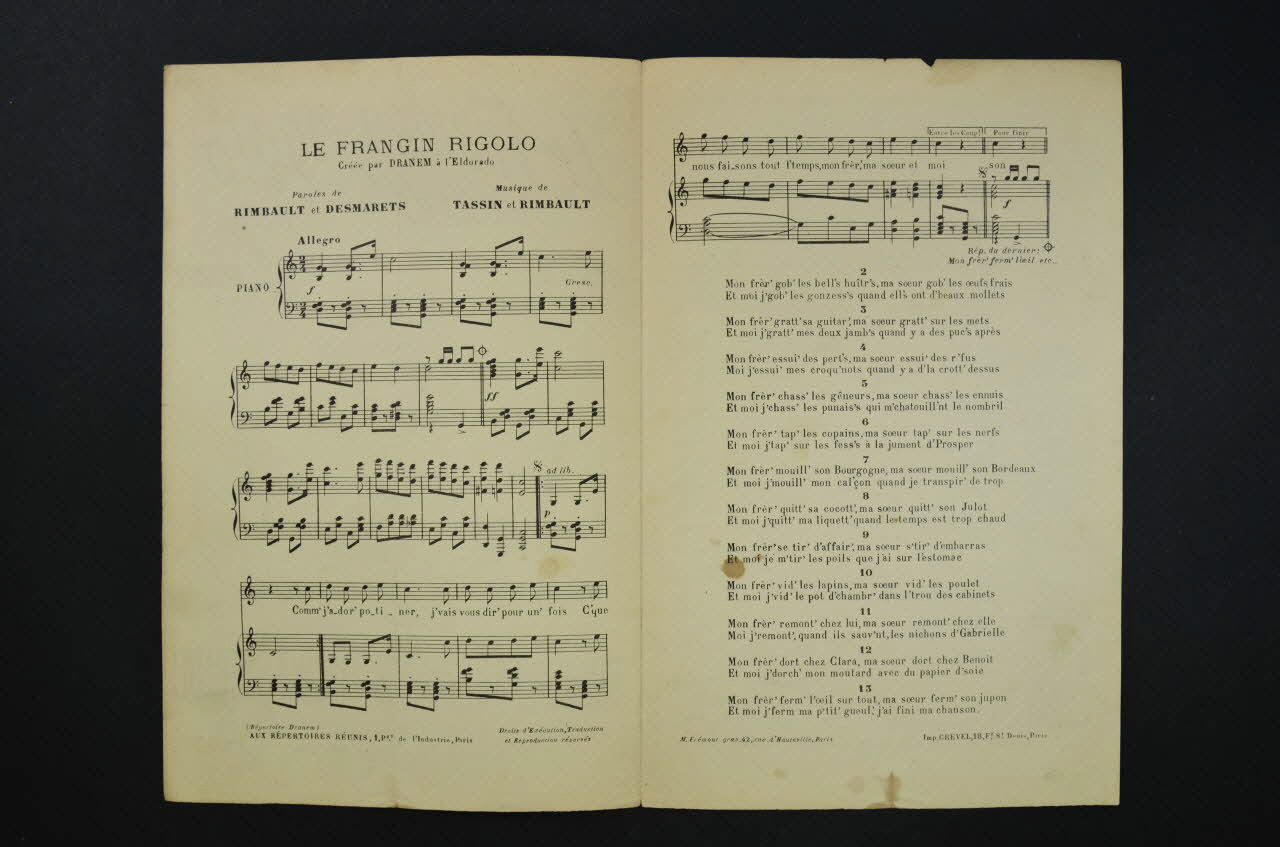 Des inscriptions renseignent le titre, les auteurs, les exécutants et l'éditeur. A l'intérieur, partition et paroles de la chanson. Au dos, liste d'autres partitions publiées par l'éditeur.Matériaux et techniques