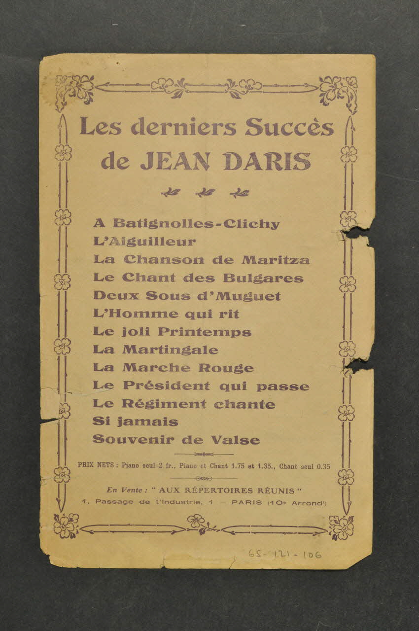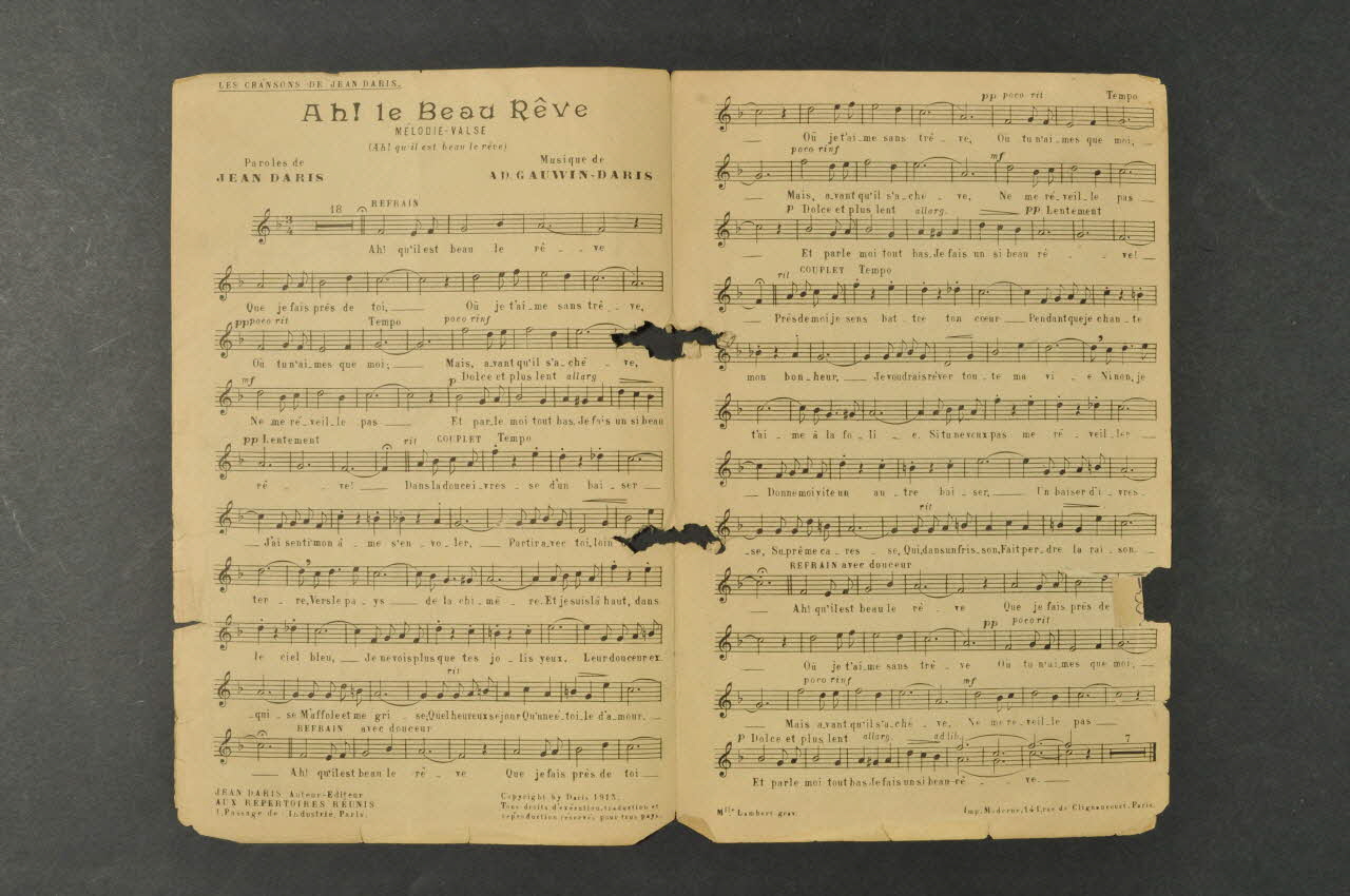 Les inscriptions renseignent le titre de la chanson, le nom des auteurs, de l'artiste et de l'éditeur. A l'intérieur, partitions et paroles de la chanson. Au dos, liste d?autres partitions publiées par l?éditeur.Matériaux et techniques