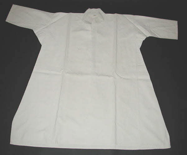 Toile de lin blanche / Chemise longue et évasée en toile de lin blanche. Encolure ronde, col rond décoré d'une borderie géométrique. Ouverture partant de l'encolure. Manches trois-quart et ajustées avec soufflets sans manchettes. Initiales "LF" brodées au point de croix au fil de coton rouge à droite de l'ouverture.Matériaux et techniques