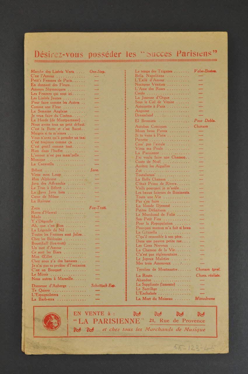 Les inscriptions renseignent le titre de la chanson, le nom des auteurs, de l'artiste et de l'éditeur. A l'intérieur, partitions et paroles de la chanson. Au dos, liste d?autres partitions publiées par l?éditeur.Décor