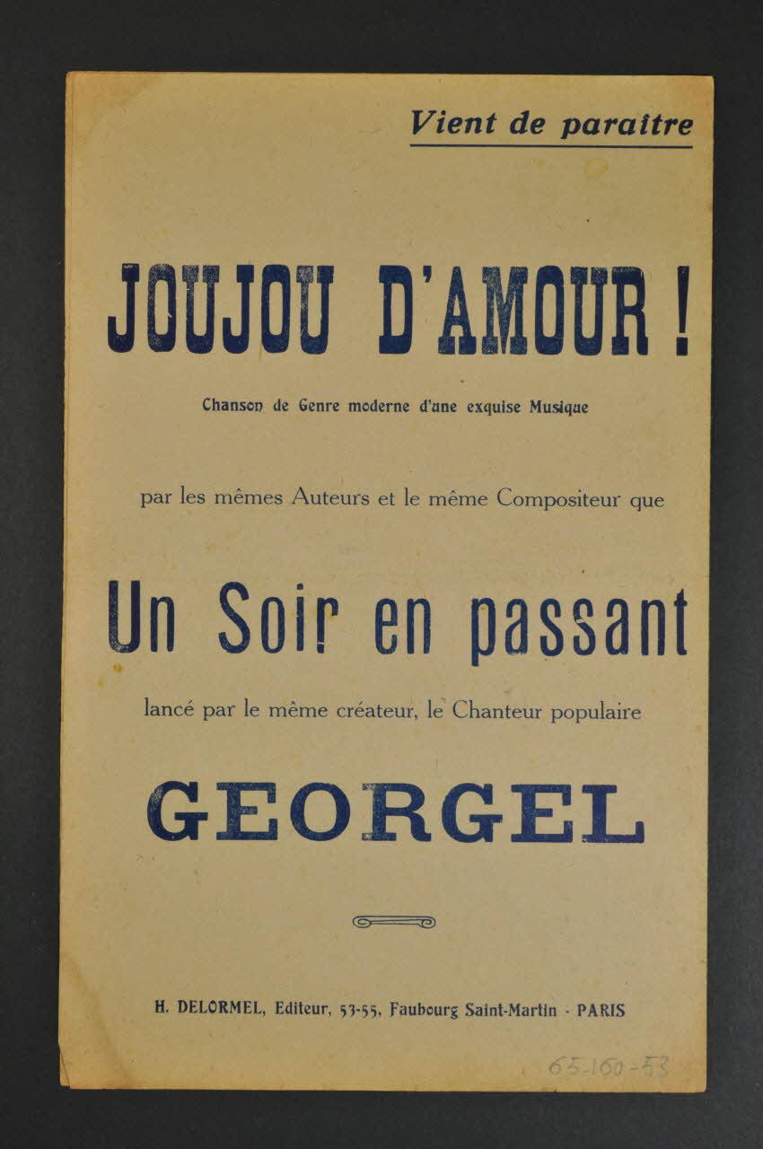 Les inscriptions renseignent le titre de la chanson, le nom des auteurs, de l'artiste et de l'éditeur. A l'intérieur, partitions et paroles de la chanson. Au dos, liste d?autres partitions publiées par l?éditeur.Décor