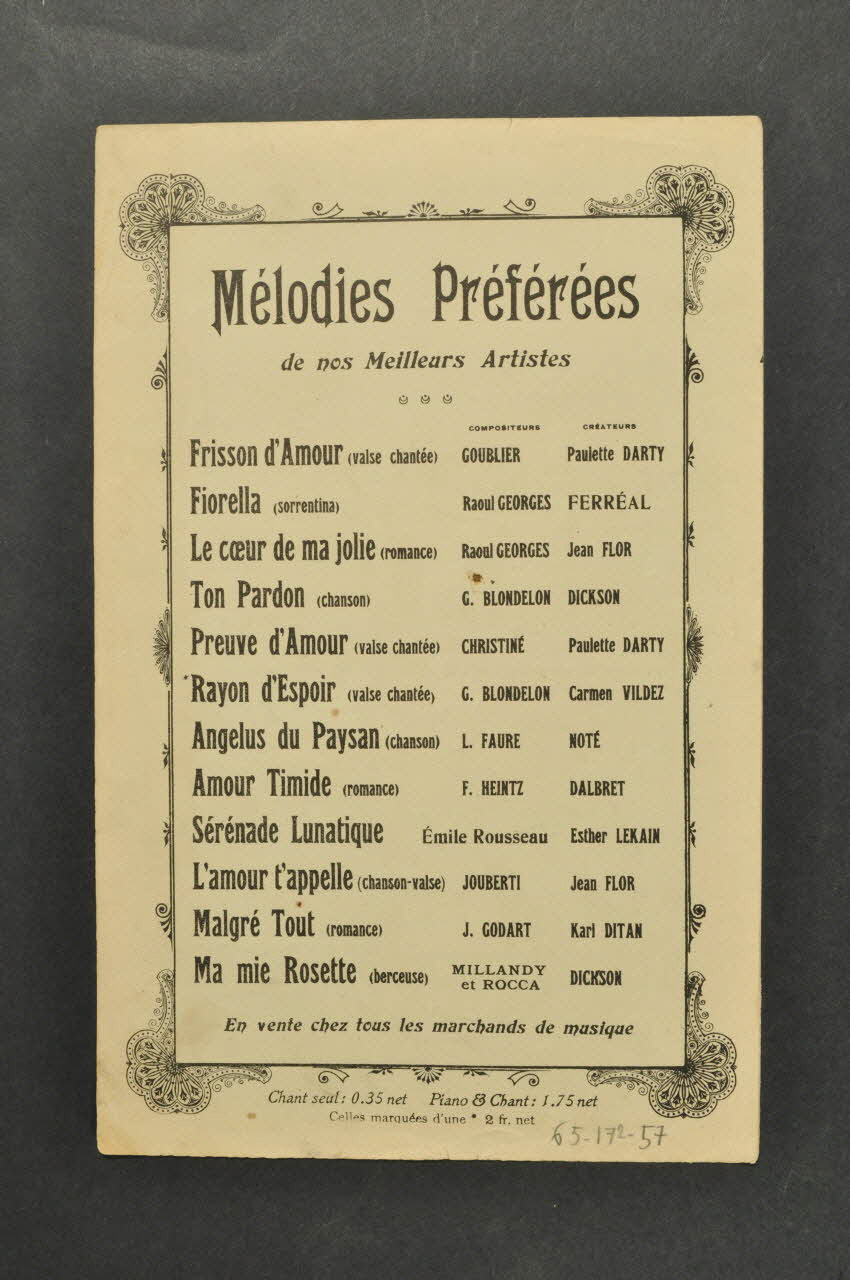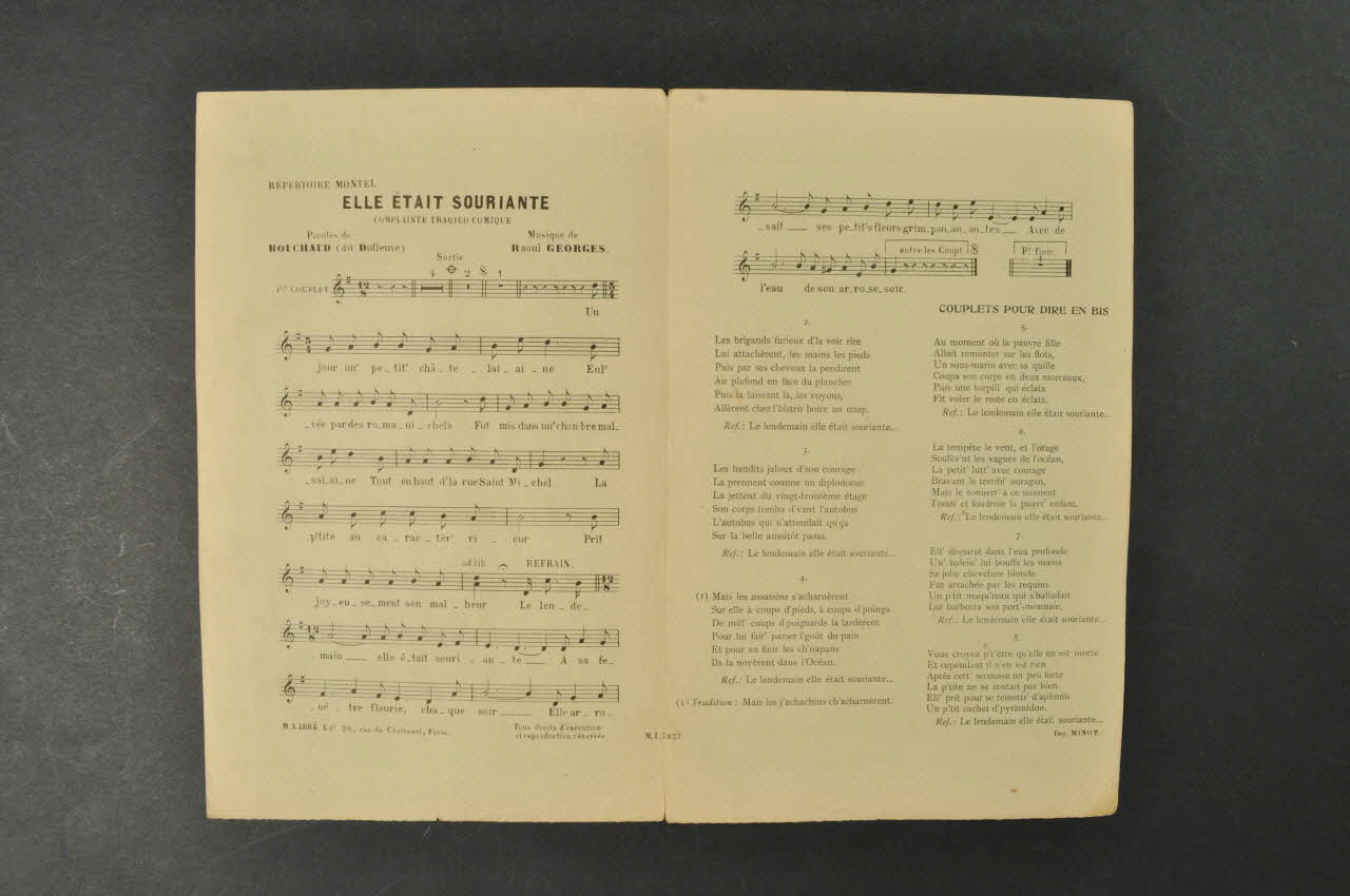 Des inscriptions renseignent le titre, les auteurs, les exécutants et l'éditeur. A l'intérieur, partition et paroles de la chanson. Au dos, liste d'autres partitions publiées par l'éditeur.Décor