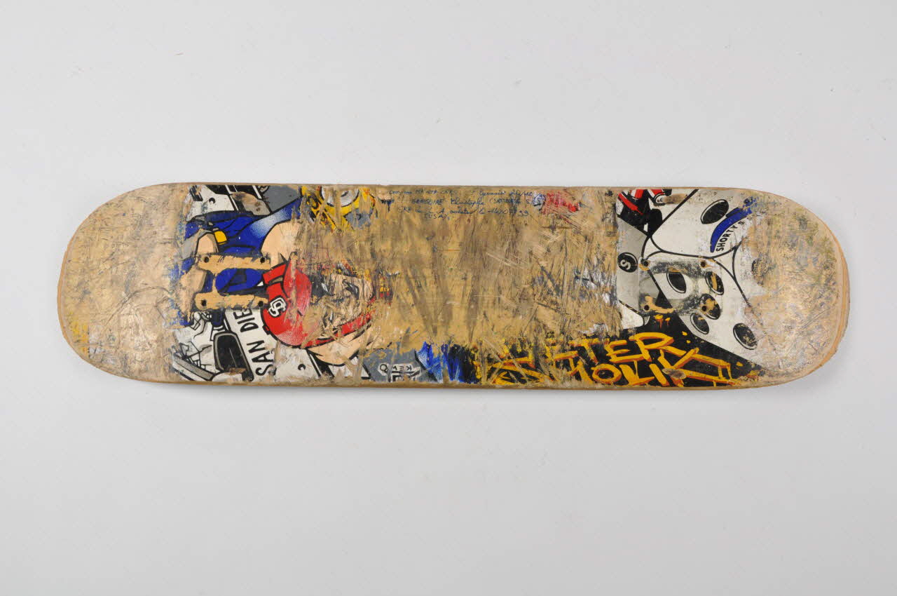 SAN DIE / KEWO / SKATER MOLIK / SHORTY'S (Plusieurs inscriptions qui font partie de la sérigraphie qui faisait partie du décor original (rayée et incomplète).Trois en lettres noires et une en lettres jaunes.), dessousTexte